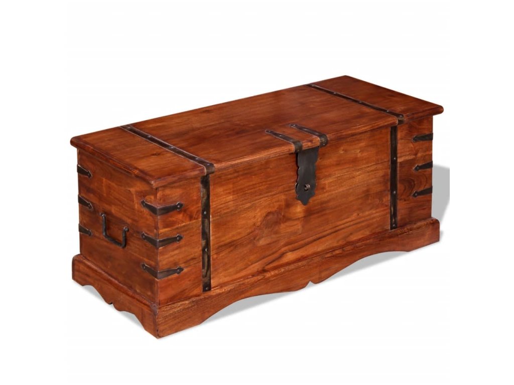 Úložný box poskytuje množstvo úložného priestoru na odkladanie oblečenia, časopisov, kníh, náradia a iných potrieb. Na prednej strane sa nachádza západka a po stranách dve rúčky. Drevený box so stabilnou a rovnou vrchnou doskou sa dá využívať aj ako konferenčný stolík, stolík ku gauču, stolík do obývačky, príručný stolík, odkladací stolík a podobne. Úložná truhlica je ručne vyrobená z akáciového masívu, ktorý má podobné vlastnosti ako palisandrové a ružové drevo. Vďaka kvalitnému remeselnému opracovaniu a krásnej textúre dreva je každý kus nábytku výnimočný a trochu odlišný od ostatných.