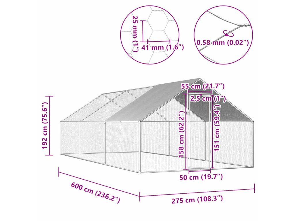 Multidom Vonkajšia klietka pre sliepky 2,75x6x1,92 m, pozinkovaná oceľ