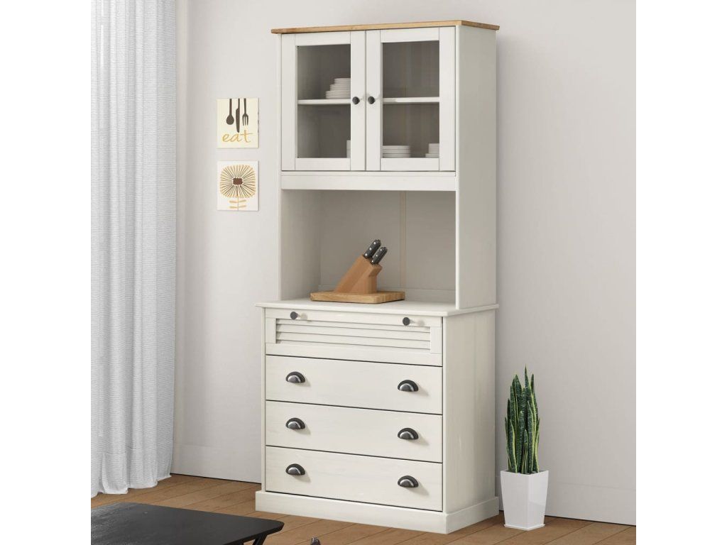 - Borovicový masív: Borovicový masív je krásny prírodný materiál. Borovicové drevo má rovnú kresbu a nachádzajú sa na ňom uzly, ktoré tomuto materiálu dodávajú charakteristický rustikálny vzhľad. Príborník je vyrobený z masívneho borovicového dreva a je odolný a pevný.