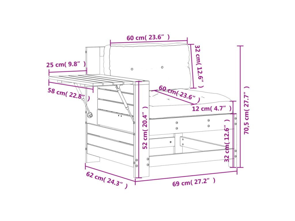 - Pohodlný bočný stolík: Tento vonkajší nábytok je vybavený sklápacím bočným stolíkom s plynovou pružinou na opierkach, ktorý poskytuje pohodlné miesto na odkladanie potrebných vecí na dosah.