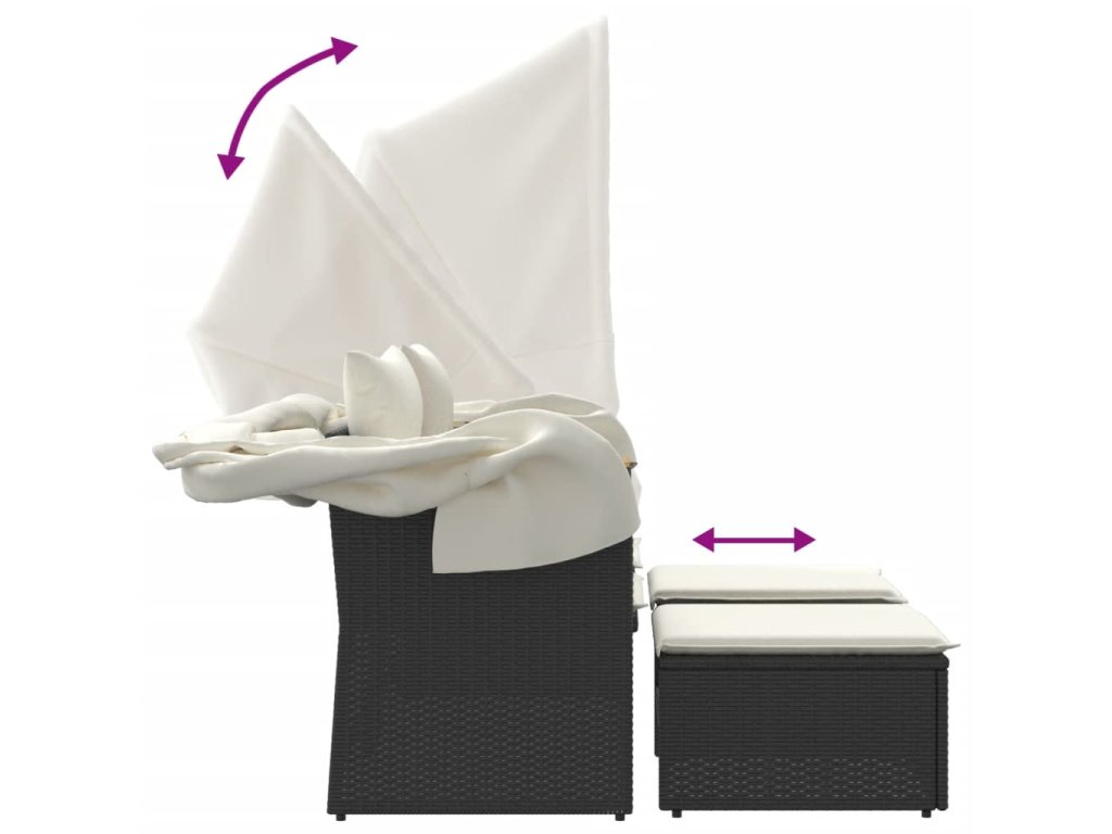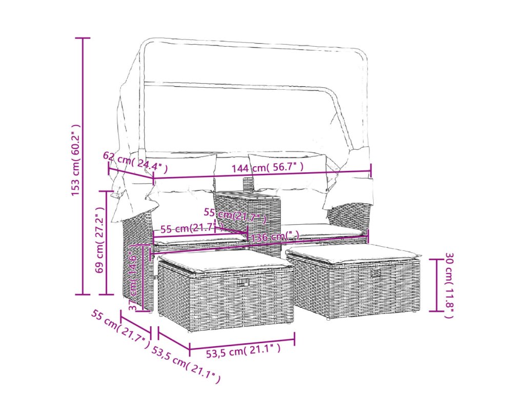 Táto záhradná pohovka so strieškou a taburetkami je dokonalým doplnkom na váš dvor, terasu alebo verandu, a poskytuje pohodlný a príjemný priestor na rozhovory s rodinou a priateľmi alebo jednoducho na relaxáciu a užívanie si pobytu vonku.