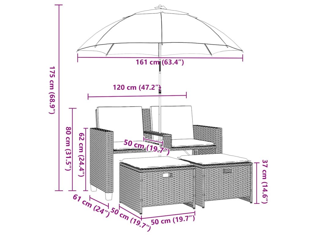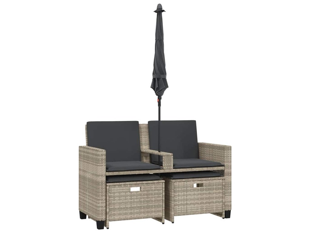 Táto záhradná pohovka so slnečníkom a podnožkami je dokonalým doplnkom na váš dvor, terasu alebo verandu a poskytuje pohodlný a príjemný priestor na rozhovory s rodinou a priateľmi alebo jednoducho na oddych a užívanie si vonku.