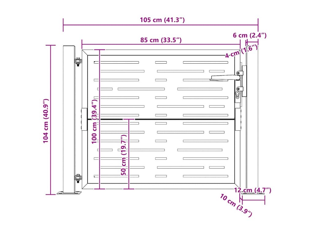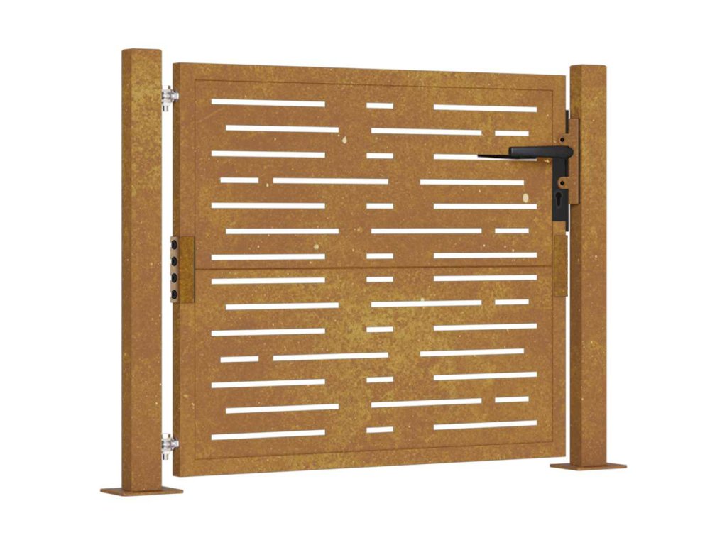 - Odolná konštrukcia: Táto plotová brána je vyrobená z kortenovej ocele. Kortenová oceľ, tiež známa ako oceľ odolná voči poveternostným vplyvom. Je vo svojej podstate antikorózna. Pri prvom vystavení atmosférickým podmienkam sa na nej vytvorí hrdzavá vrstva, ktorá chráni pred koróziou. Preto ju nemusíte natierať. Vďaka tomu ušetríte náklady na údržbu a opravy. Výrazný hnedý odtieň cortenovej ocele zaručene upúta pozornosť. Oceľ je odolná voči poveternostným podmienkam, a je mimoriadne trvácna a obstojí v skúške časom.