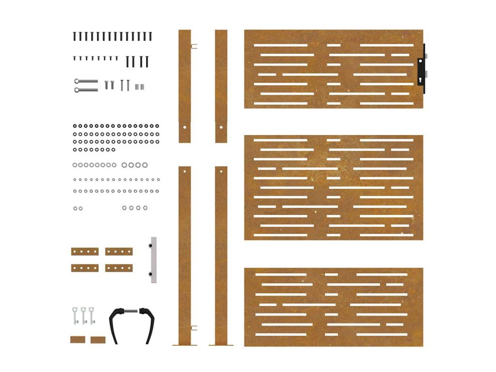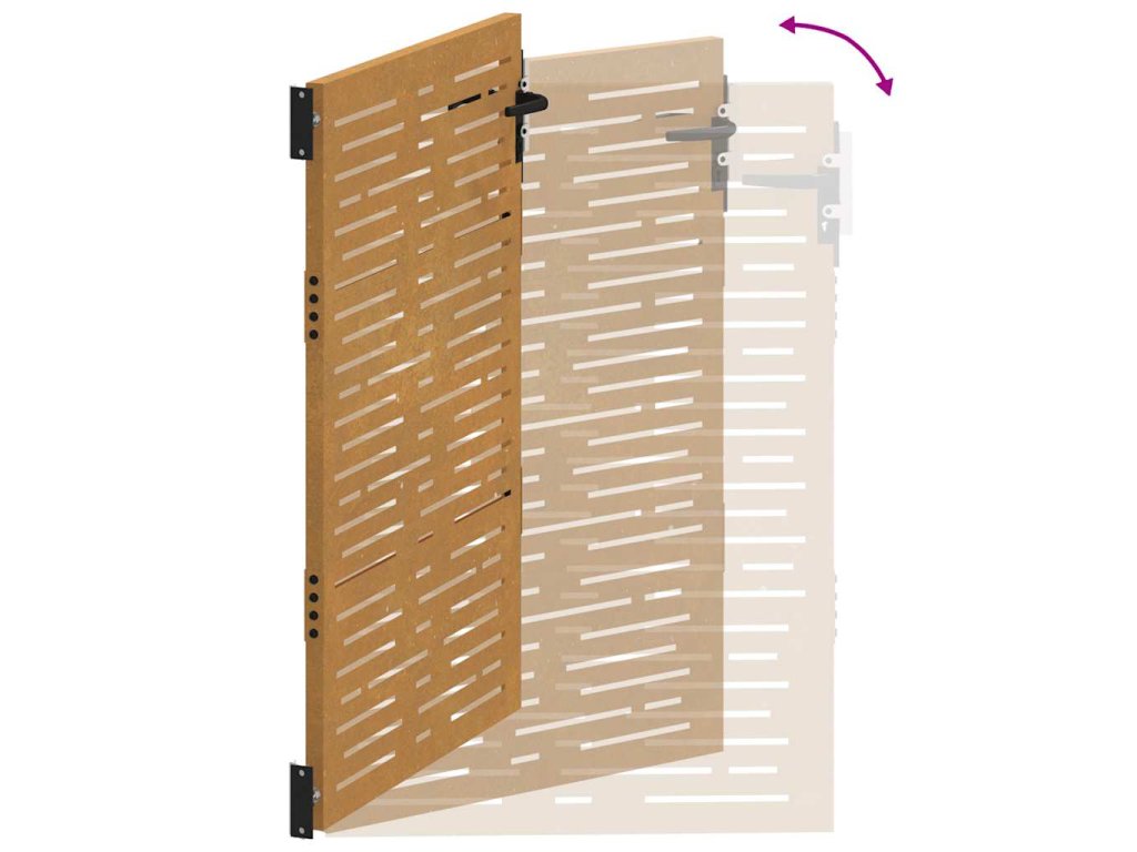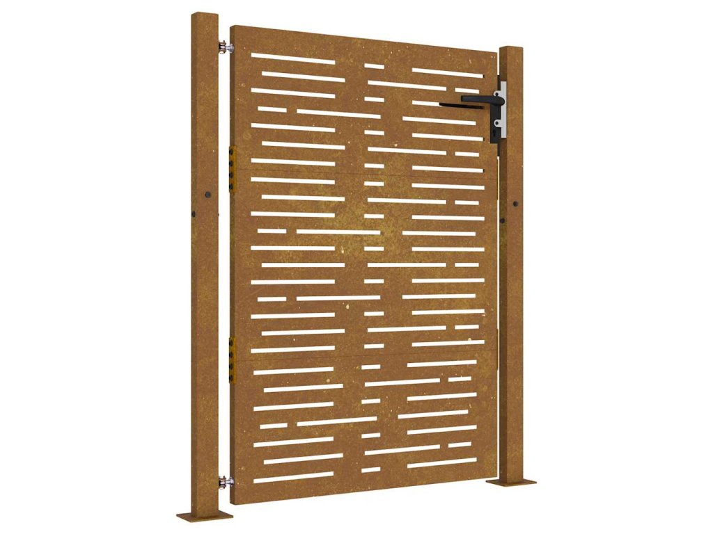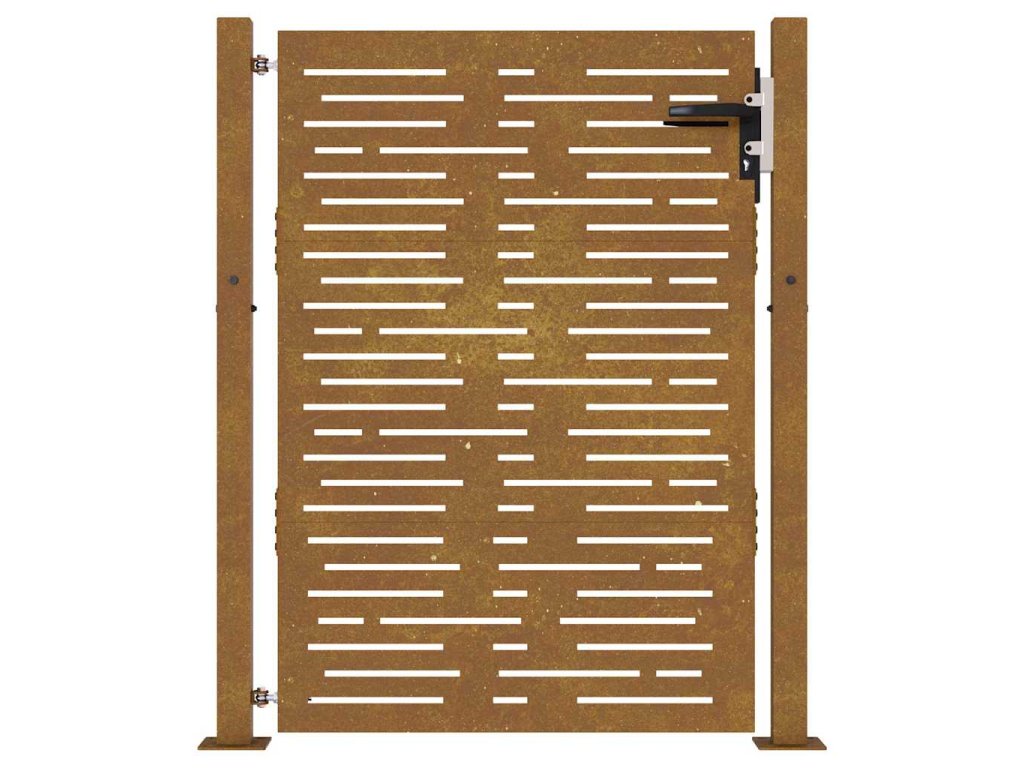 - Odolný materiál: Kovová brána je vyrobená z kortenovej ocele. Kortenová oceľ, tiež známa ako oceľ odolná voči poveternostným vplyvom. Je vo svojej podstate antikorózna. Pri prvom vystavení atmosférickým podmienkam sa na nej vytvorí hrdzavá vrstva, ktorá chráni pred koróziou. Preto ju nemusíte natierať. Vďaka tomu ušetríte náklady na údržbu a opravy. Výrazný hnedý odtieň cortenovej ocele zaručene upúta pozornosť. Poveternostne odolná oceľ je mimoriadne trvácna a obstojí v skúške časom.