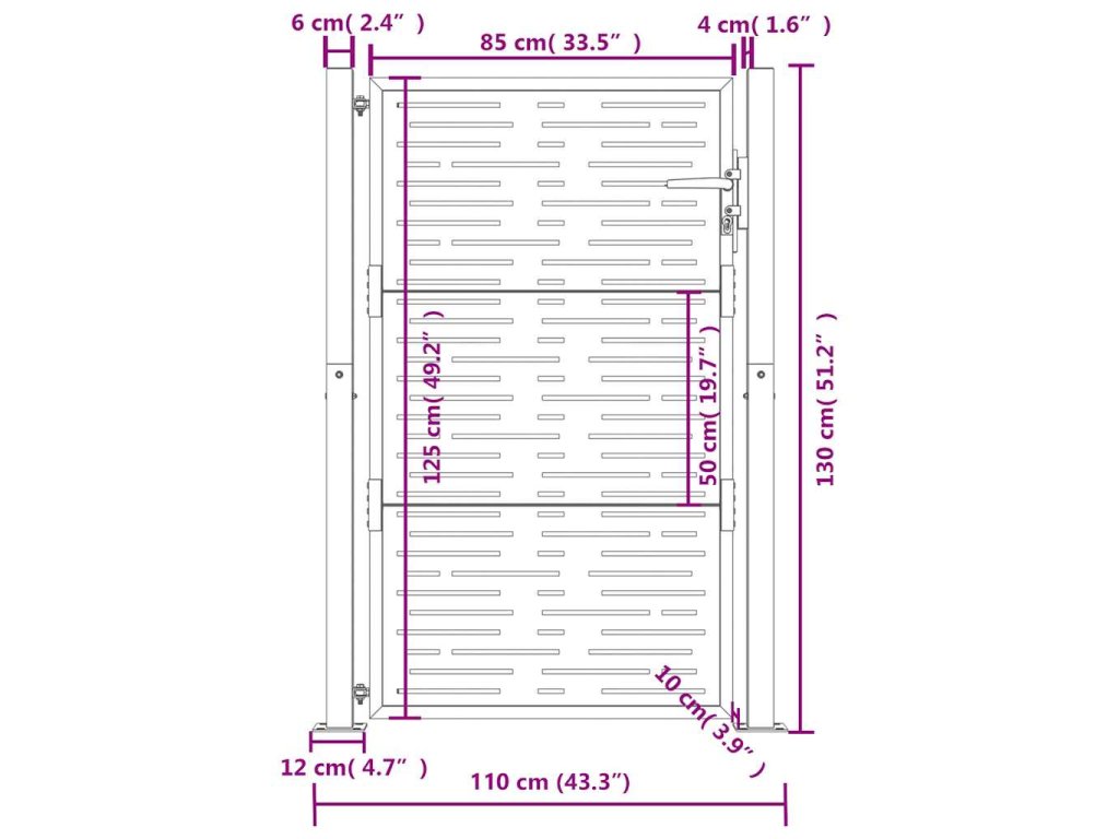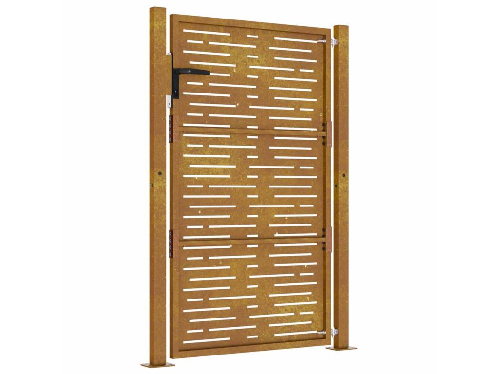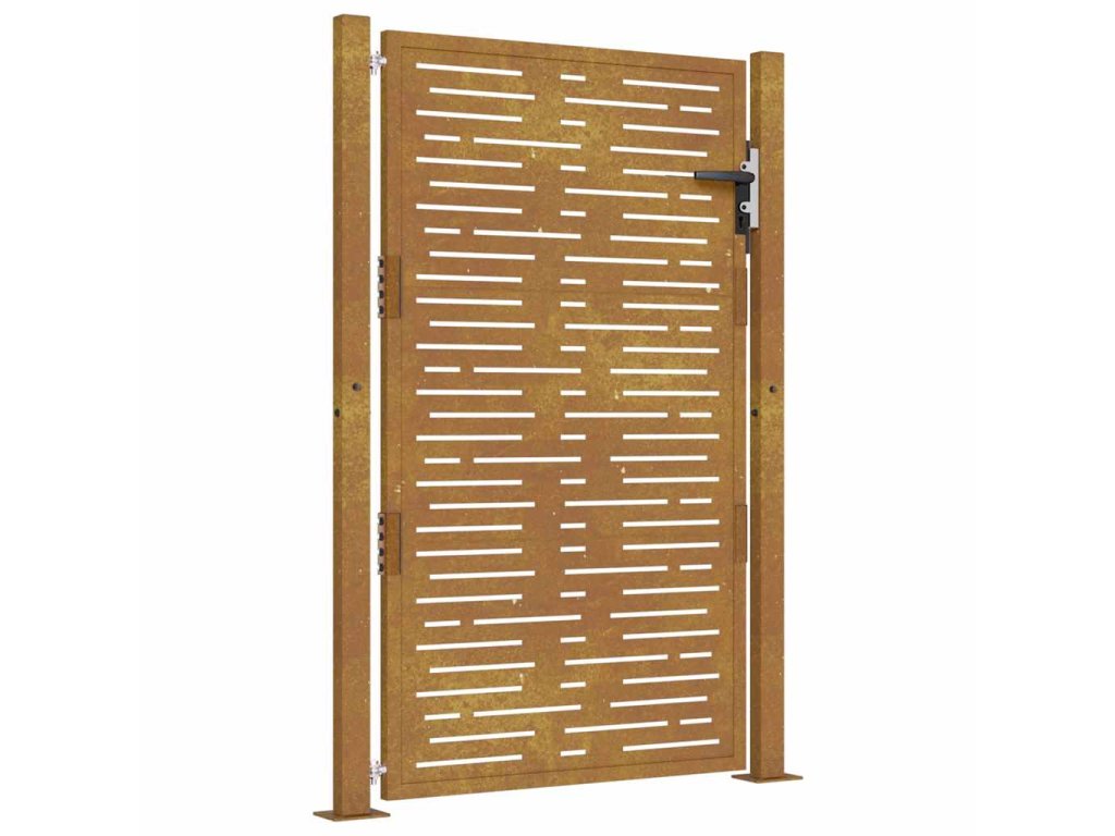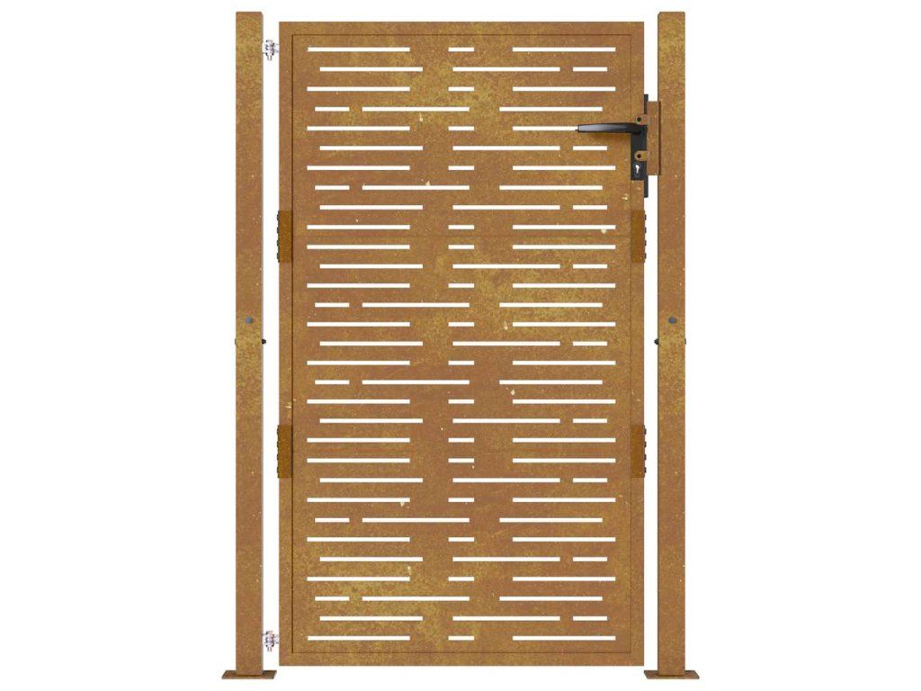 - Odolná konštrukcia: Táto plotová brána je vyrobená z kortenovej ocele. Kortenová oceľ, tiež známa ako oceľ odolná voči poveternostným vplyvom. Je vo svojej podstate antikorózna. Pri prvom vystavení atmosférickým podmienkam sa na nej vytvorí hrdzavá vrstva, ktorá chráni pred koróziou. Preto ju nemusíte natierať. Vďaka tomu ušetríte náklady na údržbu a opravy. Výrazný hnedý odtieň cortenovej ocele zaručene upúta pozornosť. Oceľ je odolná voči poveternostným podmienkam, a je mimoriadne trvácna a obstojí v skúške časom.