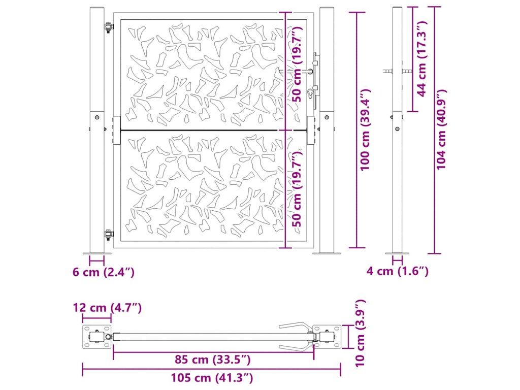 - Odolná konštrukcia: Táto plotová brána je vyrobená z kortenovej ocele. Kortenová oceľ, tiež známa ako oceľ odolná voči poveternostným vplyvom. Je vo svojej podstate antikorózna. Pri prvom vystavení atmosférickým podmienkam sa na nej vytvorí hrdzavá vrstva, ktorá chráni pred koróziou. Preto ju nemusíte natierať. Vďaka tomu ušetríte náklady na údržbu a opravy. Výrazný hnedý odtieň cortenovej ocele zaručene upúta pozornosť. Oceľ je odolná voči poveternostným podmienkam, a je mimoriadne trvácna a obstojí v skúške časom.