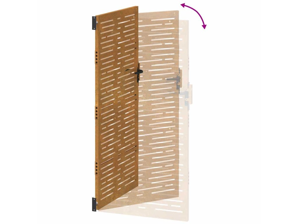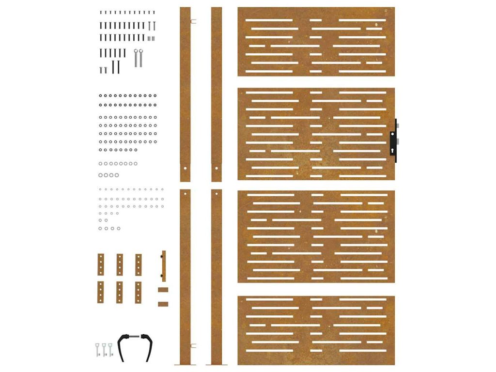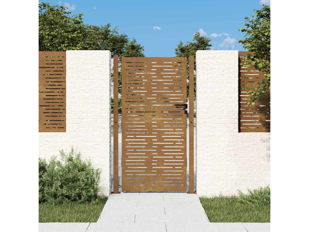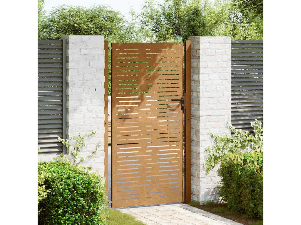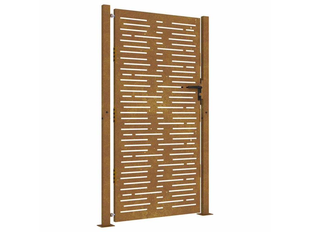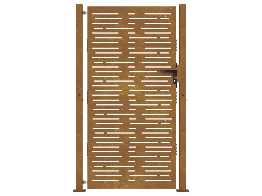 - Odolný materiál: Kovová brána je vyrobená z kortenovej ocele. Kortenová oceľ, tiež známa ako oceľ odolná voči poveternostným vplyvom. Je vo svojej podstate antikorózna. Pri prvom vystavení atmosférickým podmienkam sa na nej vytvorí hrdzavá vrstva, ktorá chráni pred koróziou. Preto ju nemusíte natierať. Vďaka tomu ušetríte náklady na údržbu a opravy. Výrazný hnedý odtieň cortenovej ocele zaručene upúta pozornosť. Poveternostne odolná oceľ je mimoriadne trvácna a obstojí v skúške časom.