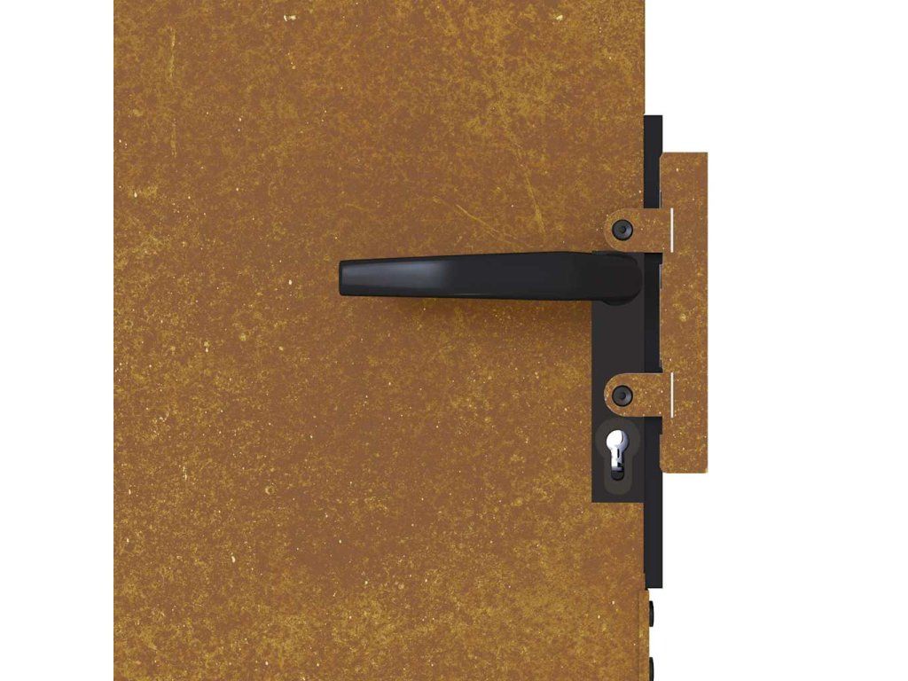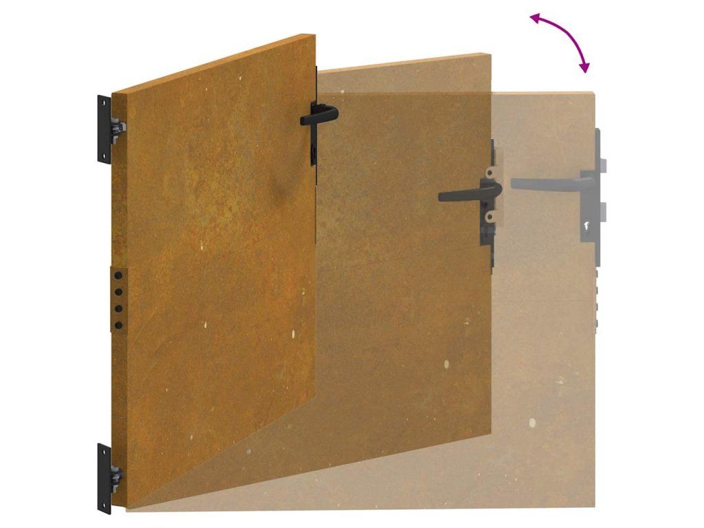 - Odolný materiál: Kovová brána je vyrobená z kortenovej ocele. Kortenová oceľ, tiež známa ako oceľ odolná voči poveternostným vplyvom. Je vo svojej podstate antikorózna. Pri prvom vystavení atmosférickým podmienkam sa na nej vytvorí hrdzavá vrstva, ktorá chráni pred koróziou. Preto ju nemusíte natierať. Vďaka tomu ušetríte náklady na údržbu a opravy. Výrazný hnedý odtieň cortenovej ocele zaručene upúta pozornosť. Poveternostne odolná oceľ je mimoriadne trvácna a obstojí v skúške časom.