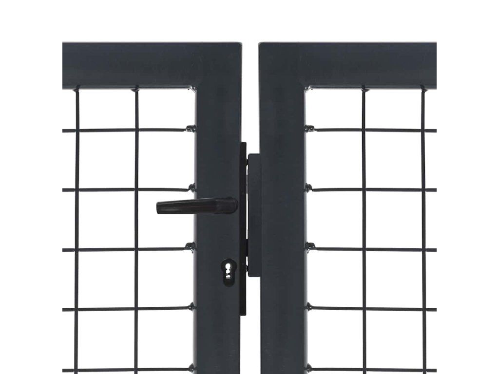 Táto robustná a trvácna záhradná brána je vyrobená z pevnej ocele s práškovou povrchovou úpravou. Odoláva hrdzi a korózii, a tak je vhodná na dlhodobé používanie v exteriéri. Záhradná brána je tvorená hrubými zváranými drôtmi, ktoré jej dodávajú mimoriadnu pevnosť, vďaka čomu poskytuje optimálnu bezpečnosť a súkromie a zároveň vytvára pôsobivý vstup na pozemok.