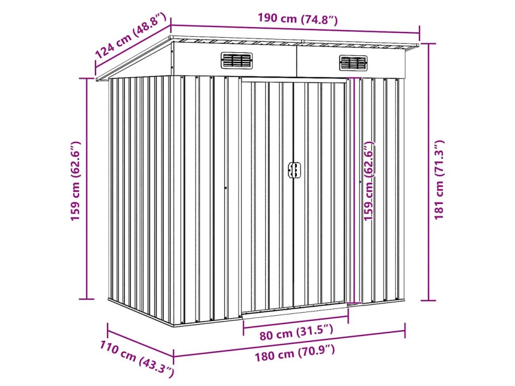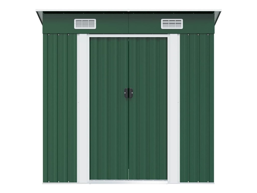 Tento skladovací domček má v prednej časti 2 vetracie otvory, ktoré zabezpečujú vynikajúce vetranie. Dvojité posuvné dvere v prednej časti umožňujú jednoduchý vstup a výstup. Pozinkovaná oceľová konštrukcia spolu s pozinkovaným povrchom ju robí odolnou a pevnou, takže nekoroduje ani ju neovplyvňuje extrémne počasie.