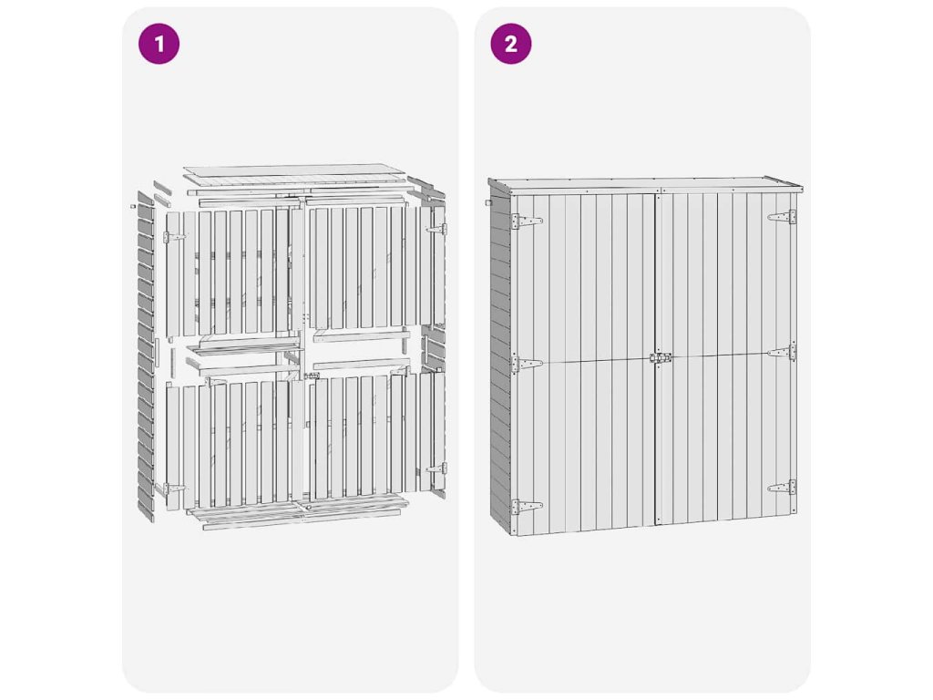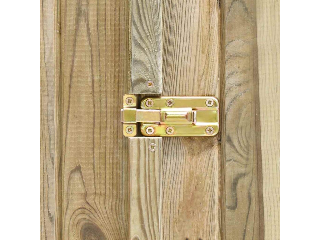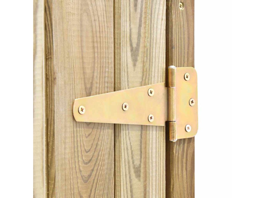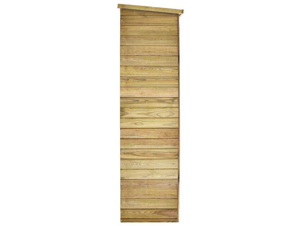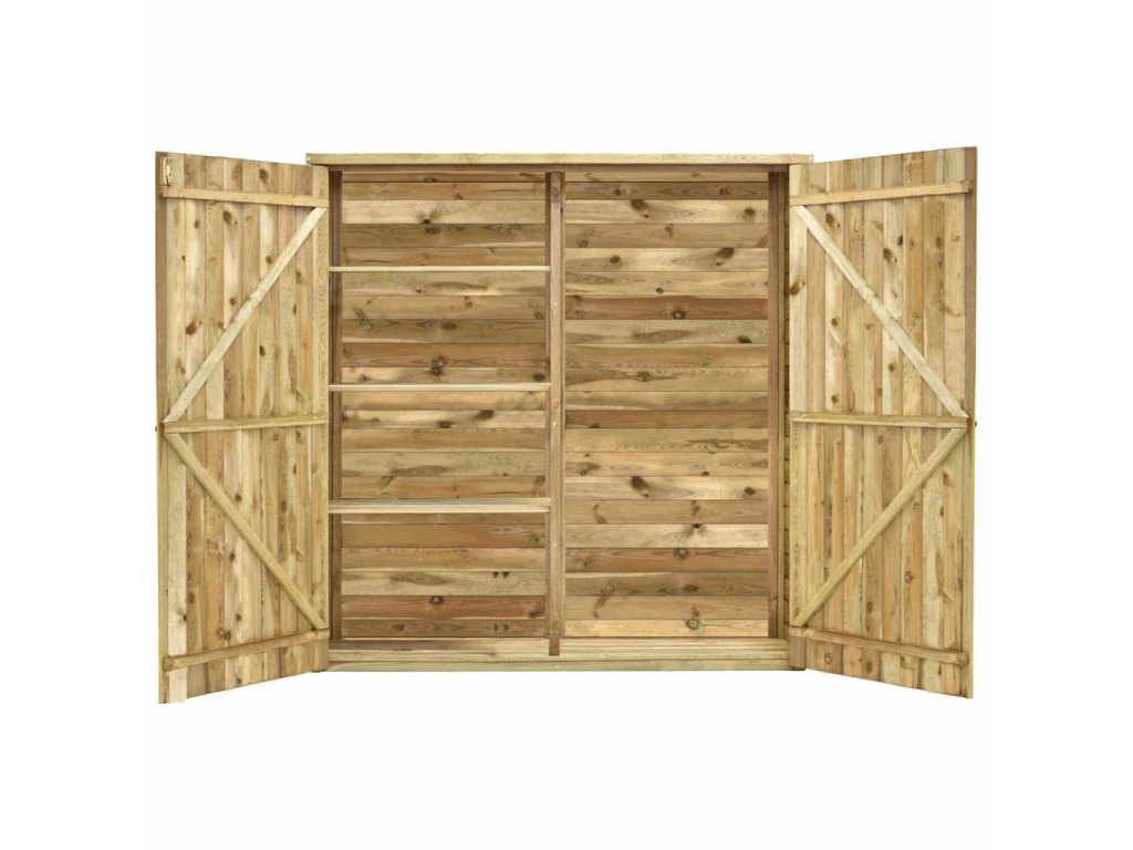 Tento prístrešok je vybavený štyrmi úhľadnými policami a veľkým bočným priestorom a je dokonale navrhnutý pre záhradné náradie, vybavenie na starostlivosť o trávnik, potreby pre bazén, ako aj náradie s dlhými rúčkami ako sú metly, hrable atď. Tento prístrešok vyrobený z kvalitného impregnovaného borovicového dreva je mimoriadne trvácny a odolný voči poveternostným vplyvom. Strecha je pokrytá asfaltovou plsťou, ktorá prístrešok chráni pred vlhkosťou. Dvojité dvere so západkovým dizajnom navyše poskytujú dodatočnú bezpečnosť.