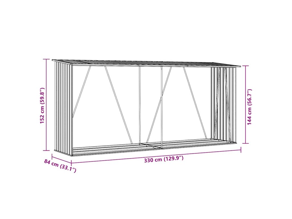 Má stabilnú konštrukciu s oceľovými nosnými tyčami a extra rúrkami na oboch stranách. Keďže je vyrobený z pozinkovanej ocele, sklad na drevo vyžaduje minimálnu údržbu a je veľmi odolný. Tento sklad na drevo obsahuje oceľový podlahový rám pre väčšiu stabilitu a zvýšené podlahové lamely, ktoré udržiavajú drevo vetrané a suché. Dažďová voda bude vďaka šikmej konštrukcii automaticky odtekať zo strechy. Náš sklad na drevo sa ľahko montuje.
