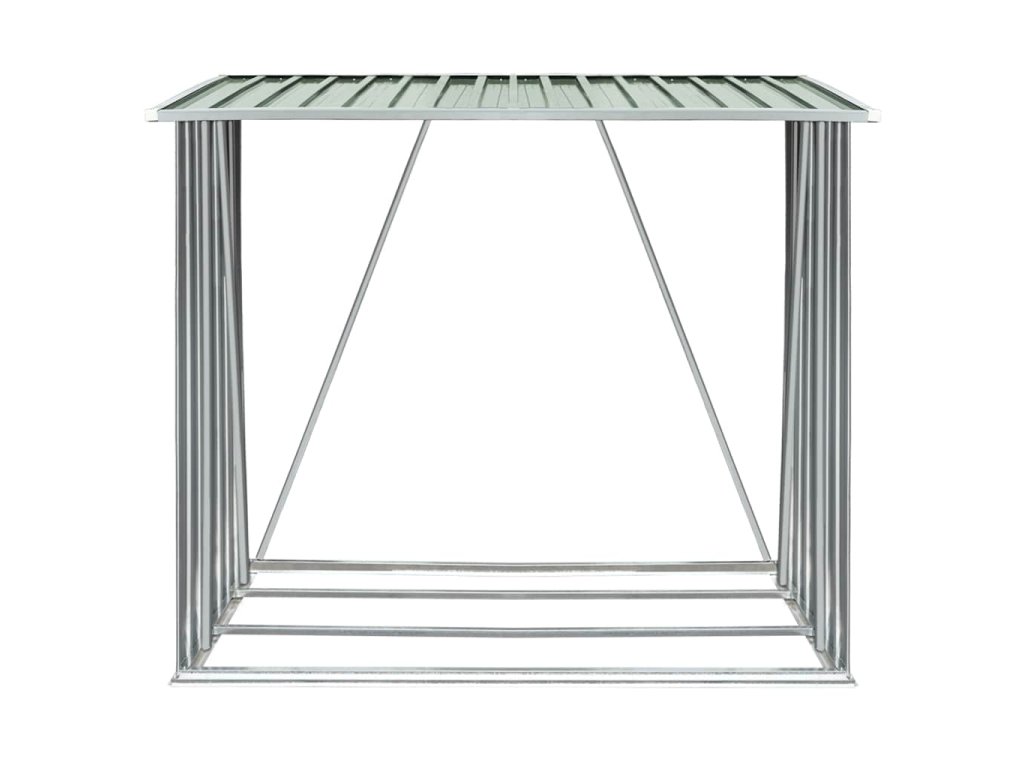 Má stabilnú konštrukciu s oceľovými nosnými tyčami a extra rúrkami na oboch stranách. Keďže je vyrobený z pozinkovanej ocele, sklad na drevo vyžaduje minimálnu údržbu a je veľmi odolný. Tento sklad na drevo obsahuje oceľový podlahový rám pre väčšiu stabilitu a zvýšené podlahové lamely, ktoré udržiavajú drevo vetrané a suché. Dažďová voda bude vďaka šikmej konštrukcii automaticky odtekať zo strechy. Náš sklad na drevo sa ľahko montuje.