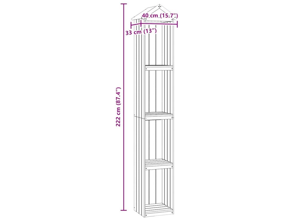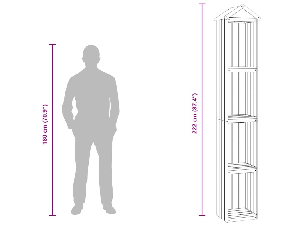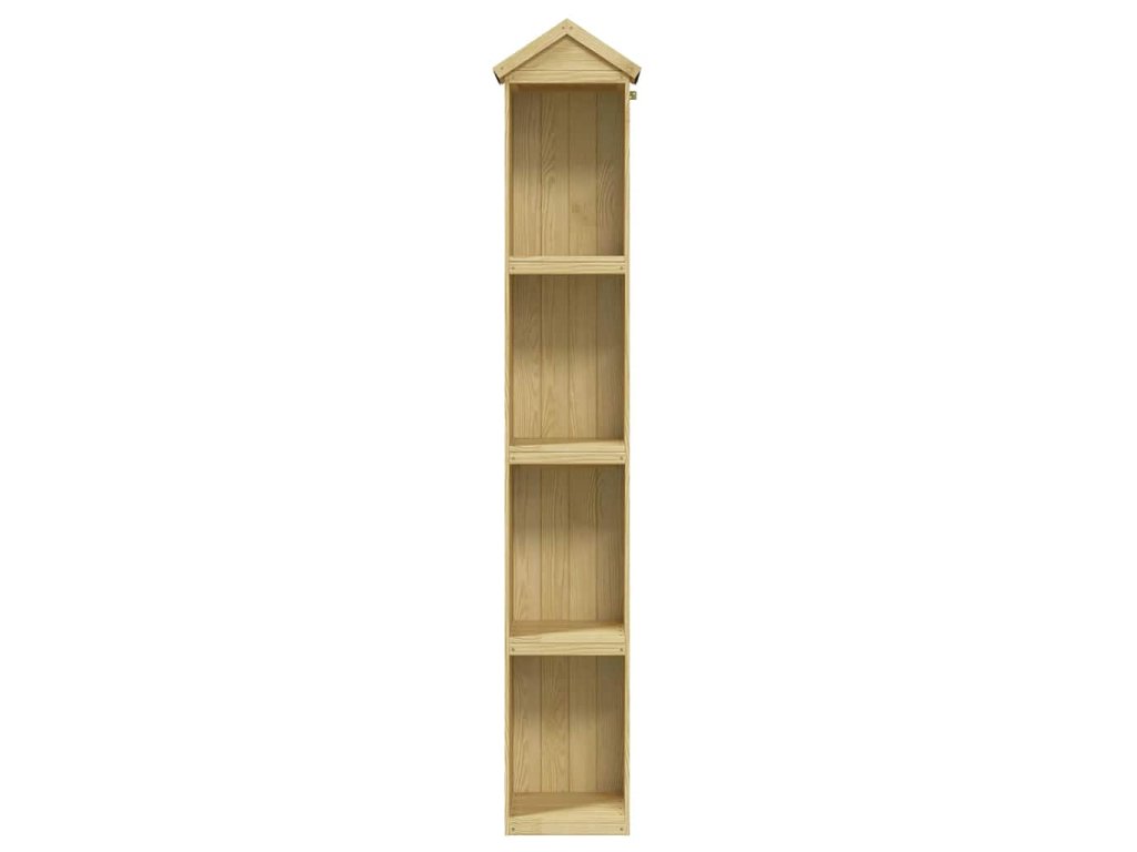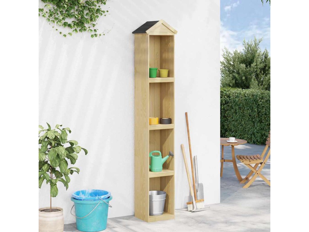 Tento prístrešok je mimoriadne trvácny a odolný voči poveternostným vplyvom, pretože bol vyrobený z kvalitného impregnovaného borovicového dreva. Strecha je pokrytá asfaltovou plsťou, ktorá ho chráni pred vlhkosťou. Prístrešok má 4 veľké otvorené police, kde môžete uložiť krhly, hrable, lopaty alebo iné záhradné náradie, ako aj iné predmety, a udržiavať ich čisté a uložené.