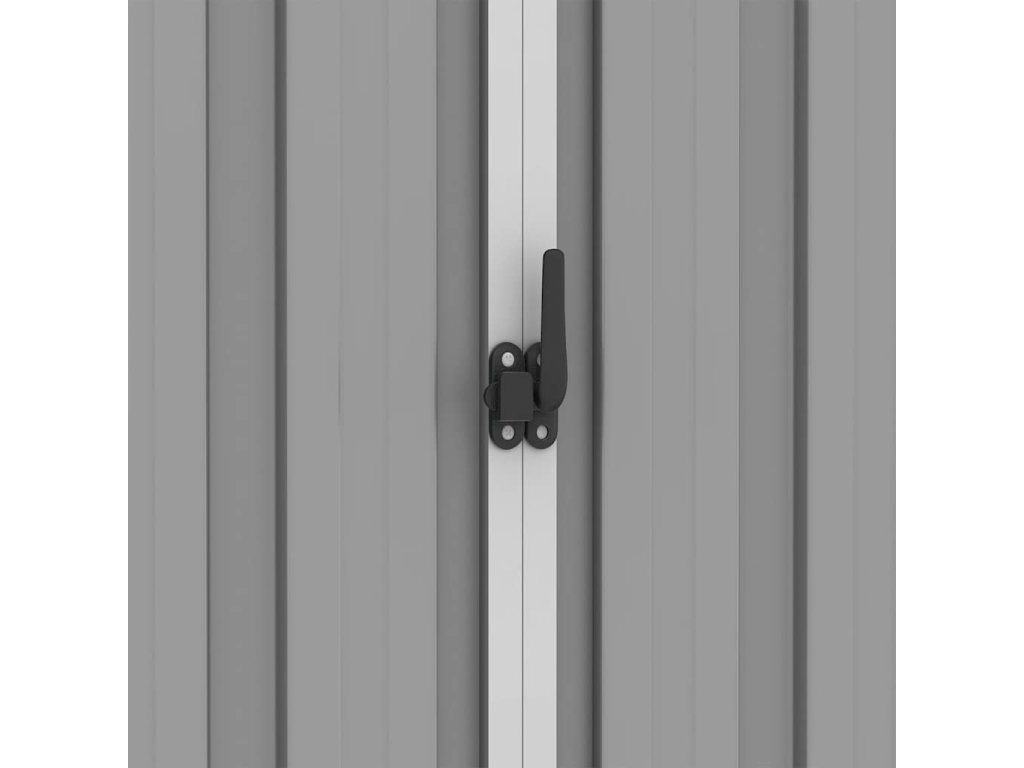 Tento skladovací domček je vybavený vetracími otvormi, ktoré slúžia ako clony, ktoré bránia dažďu. Poskytuje tiež neustále vetranie, aby sa znížilo hromadenie vlhkosti a zápachu vo vnútri. Záhradná skladovacia dielňa je vyrobená z pozinkovanej ocele, vyžaduje si minimálnu údržbu a je veľmi odolná. Dvojité dvierka vpredu umožňujú ľahký vstup a výstup. Dažďová voda automaticky odteká zo strechy vďaka naklonenému dizajnu.
