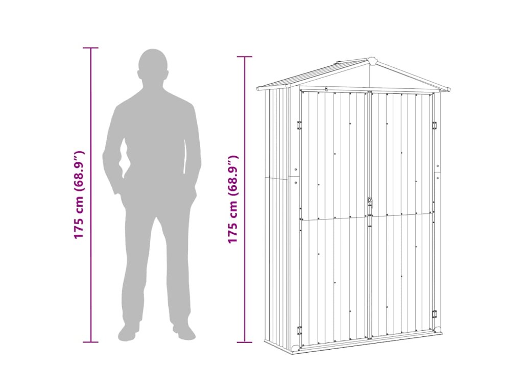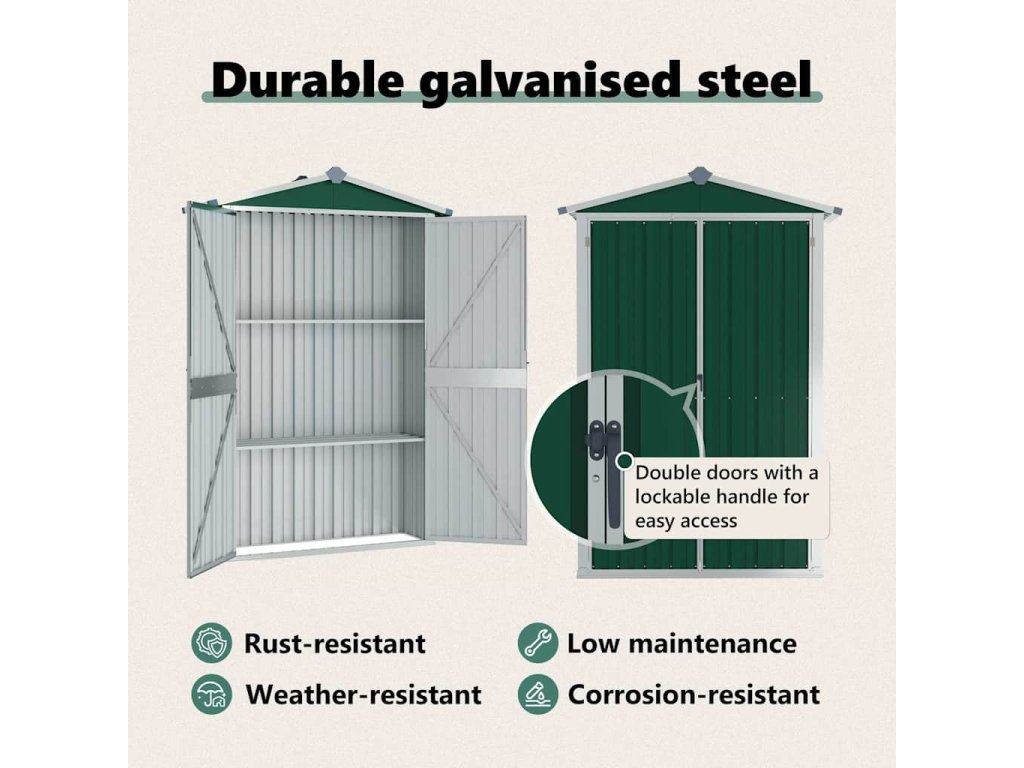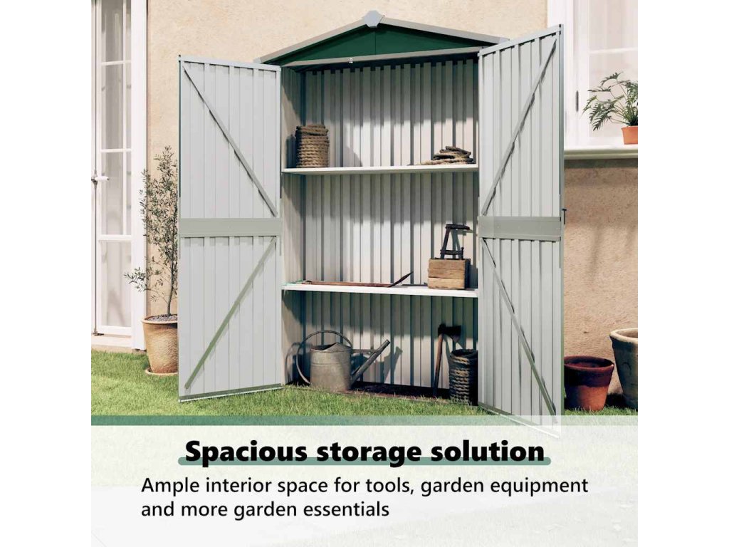 Tento skladovací domček je vybavený vetracími otvormi, ktoré zabezpečujú vetranie a znižujú hromadenie vlhkosti a zápachu v dome. Vďaka policiam ponúka dostatok úložného priestoru na usporiadanie vašich dôležitých vecí. Okrem toho je tento vonkajší skladovací domček vyrobený z pozinkovanej ocele, takže vyžaduje minimálnu údržbu a je veľmi odolný. Dvojité otváracie dvere v prednej časti umožňujú jednoduchý vstup a výstup. Dažďová voda automaticky odteká zo strechy vďaka šikmej konštrukcii.