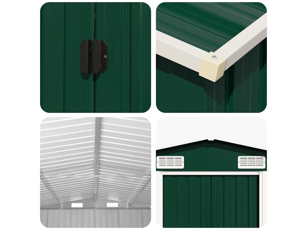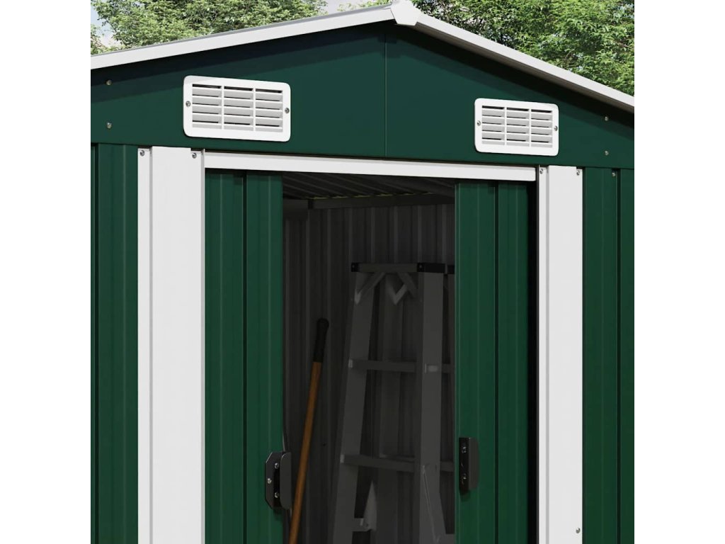 Tento skladovací domček má vetracie otvory, ktoré zabezpečujú vynikajúce vetranie. Jeho dvojité posuvné dvere v prednej časti umožňujú jednoduchý vstup a výstup. Vďaka konštrukcii z pozinkovanej ocele je domček na náradie odolný a pevný a nekoroduje ani ho neovplyvňujú nepriaznivé poveternostné podmienky.