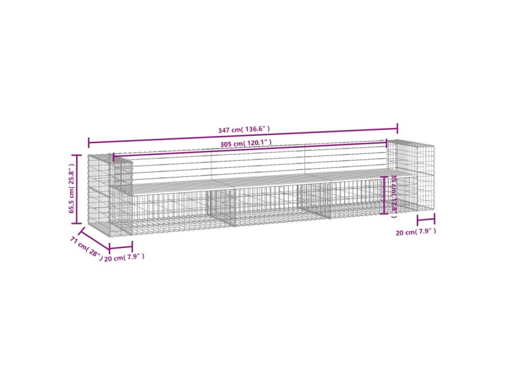 - Pevná a stabilná základňa: Táto vonkajšia lavička má základňu z koša z galvanizovanej ocele. Je navrhnutá tak, aby bola vyplnená kameňmi a štrkom pre dodatočnú krásu. Mriežku tvoria priečne a pozdĺžne drôty, ktoré sú zvarené na každom prieseku pre čo najväčšiu stabilitu.