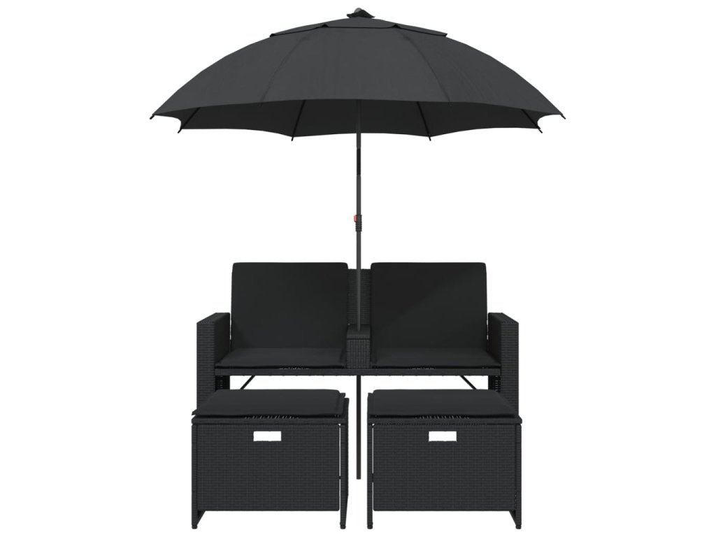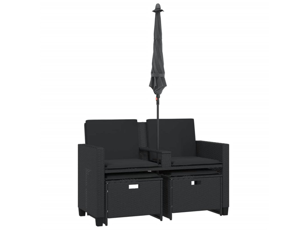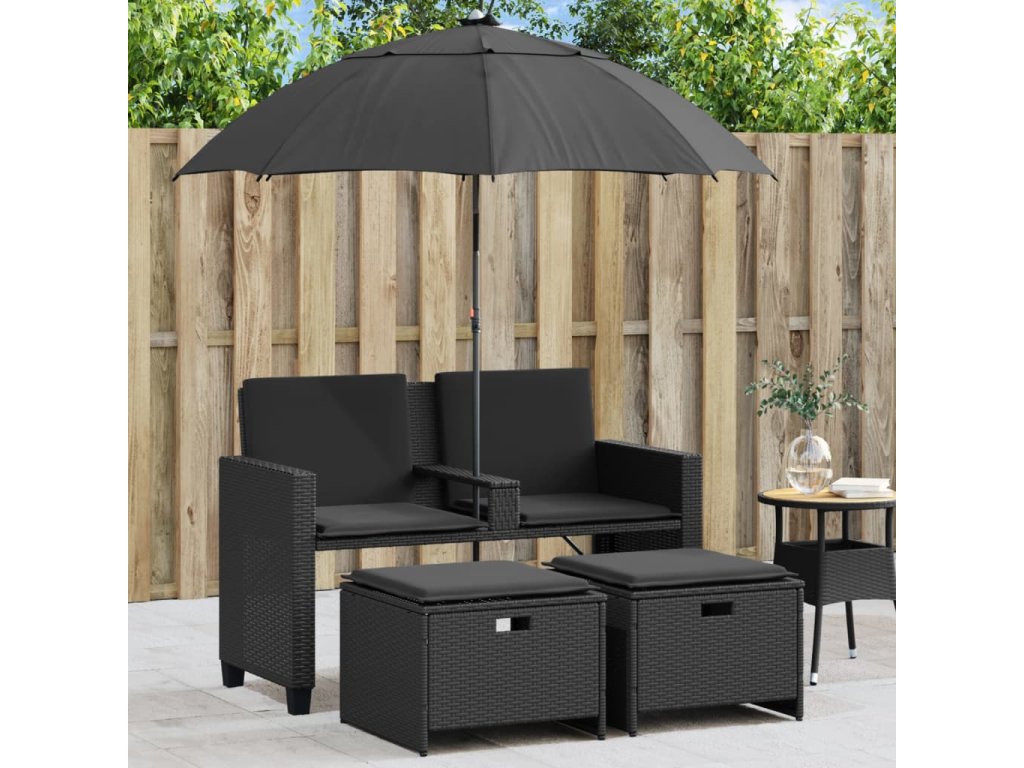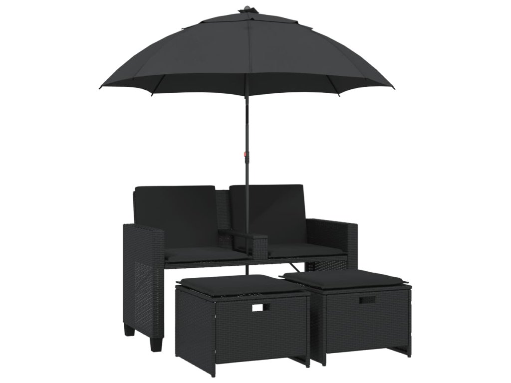 Multidom Záhradná pohovka 2-miestna slnečník+taburetky čierna polyratan