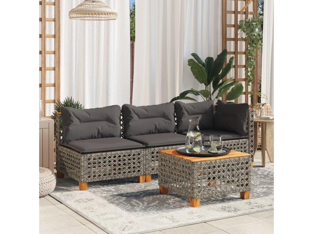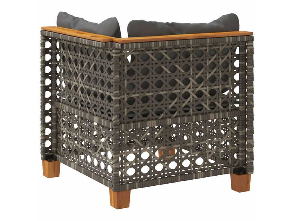 - Materiál: PE (polyetylén) ratan, oceľ s práškovou povrchovou úpravou, akáciový masív s prírodným olejovým náterom