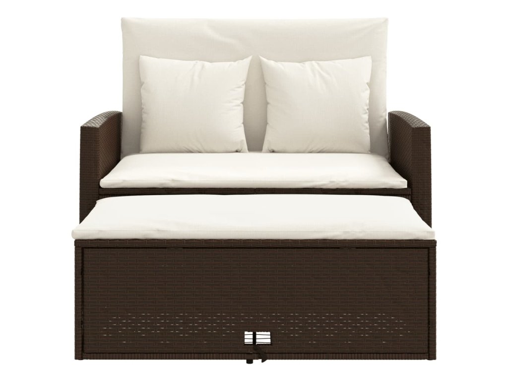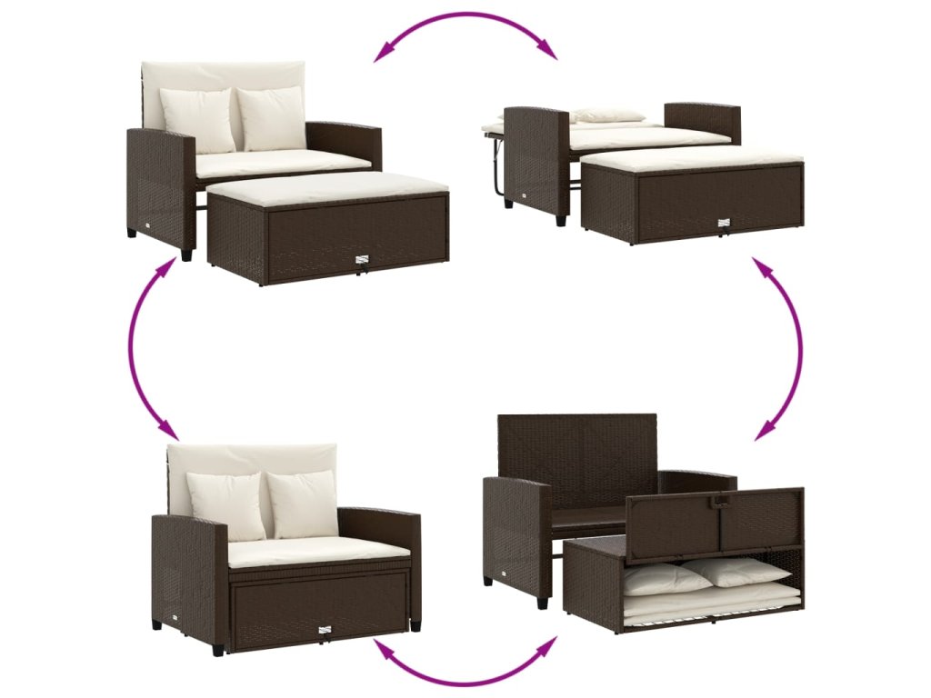 - Všestranná funkčnosť: Tento vonkajší nábytok sa dá použiť ako dvojmiestna lavica alebo rozkladacia pohovka. Jednoducho ju môžete zmeniť na posteľ sklopením operadla a vytiahnutím taburetky spod lavice. Podporné panely za operadlami zvyšujú stabilitu postele.