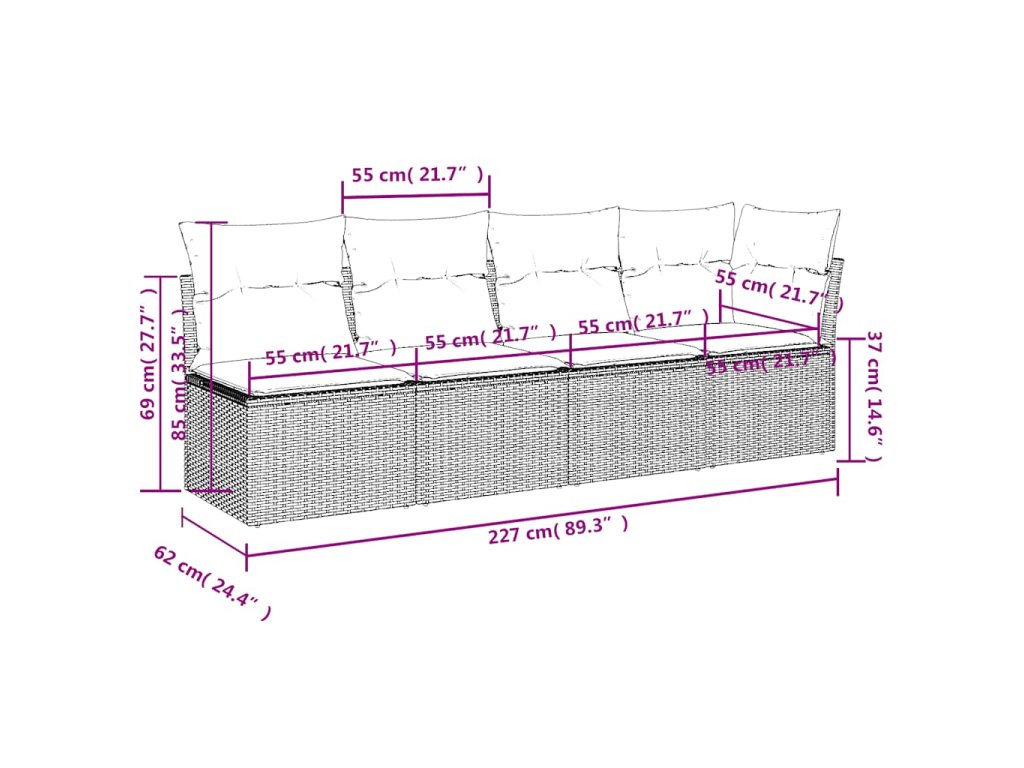 - Celkové rozmery pohovky: 227 x 62 x 69 cm (Š x H x V)