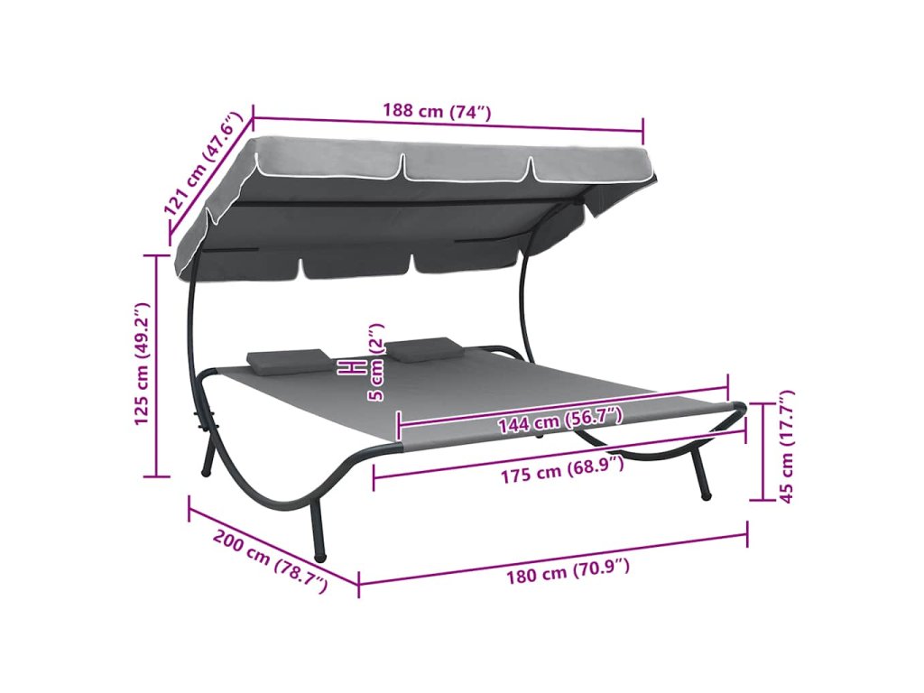 Táto záhradná posteľ pre dvoch má 2 vankúše a veľký baldachýn a predstavuje pútavý doplnok do akýchkoľvek priestorov. Poskytne vám dokonalé miesto na relaxovanie alebo zábavu s rodinou v záhrade, na dvore, terase či na pláži.
