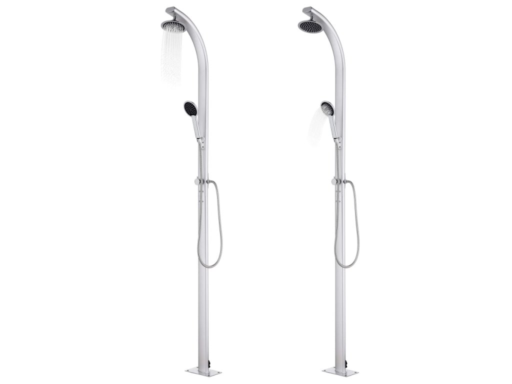 Táto vonkajšia sprcha je vyrobená z hliníka, vďaka čomu je odolná voči poveternostným vplyvom. Sprchovací systém má hlavovú sprchu a ručnú sprchu, aby vyhovoval vašim potrebám pri záhradníctve, polievaní a sprchovaní. Ručná sprcha je vybavená flexibilnou hadicou s dvojitým uzáverom a s dĺžkou 1,5 m. Je tiež vybavená mosadzným držiakom, na ktorý môžete umiestniť aj uterák.