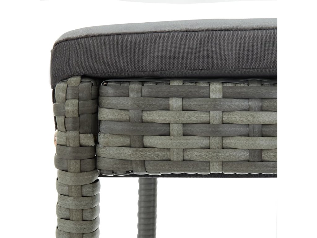 Stolička je vybavená oceľovým rámom s práškovým povrchom zabaleným do polyratanu odolného voči UV žiareniu, ktorý je stabilný a odolný. Penový polstrovaný vankúš s ľahko odnímateľným poťahom na zips ponúka ďalšiu podporu pri stolovaní alebo zábave.