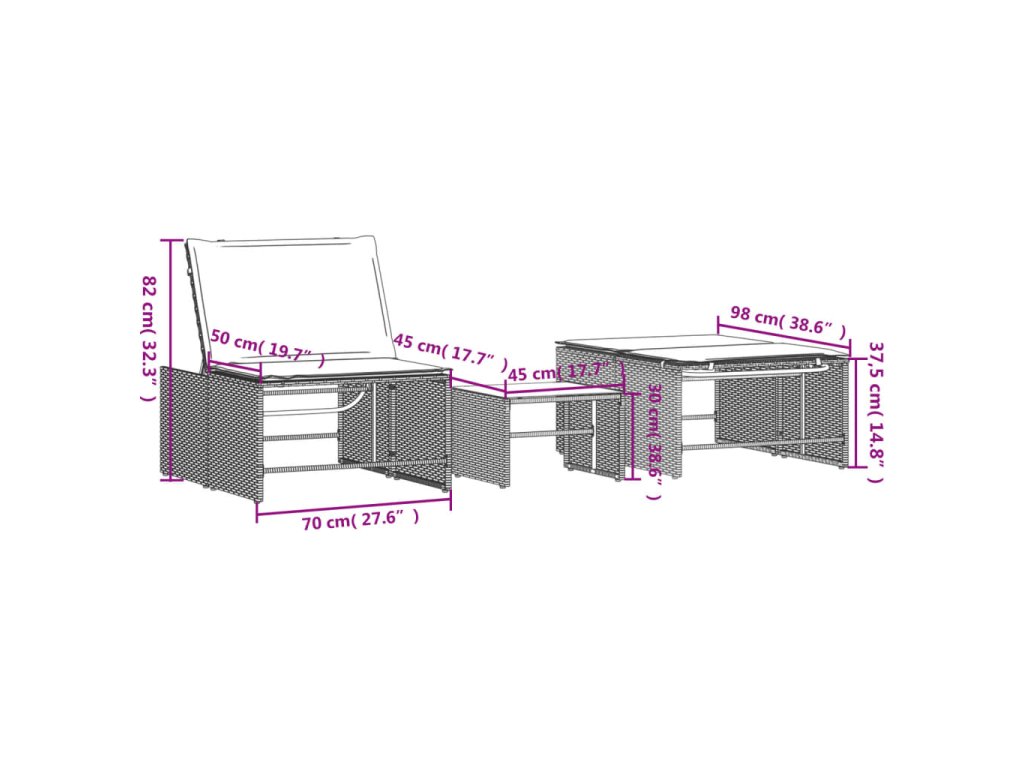 - Rozmery každého modulárneho ležadla: 70 x 98 x 40/57/71/82 cm (Š x H x V)