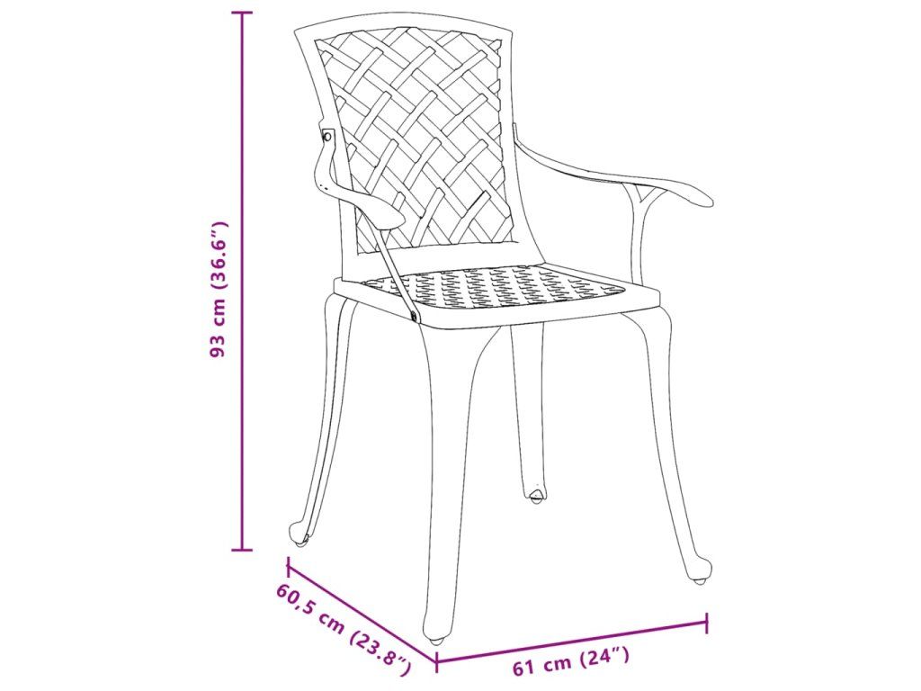- Odolný materiál: Tieto záhradné stoličky sú vyrobené z liateho hliníka, ktorý je odolný, ľahký a nenáročný na údržbu a je odolný voči korózii a vyblednutiu.