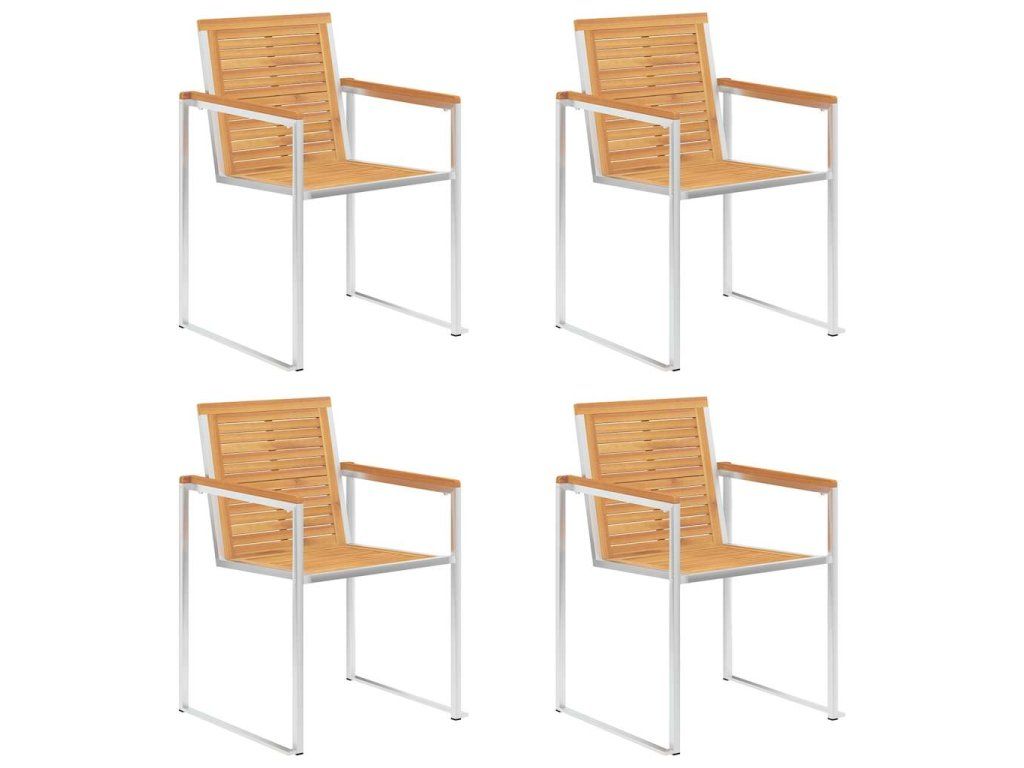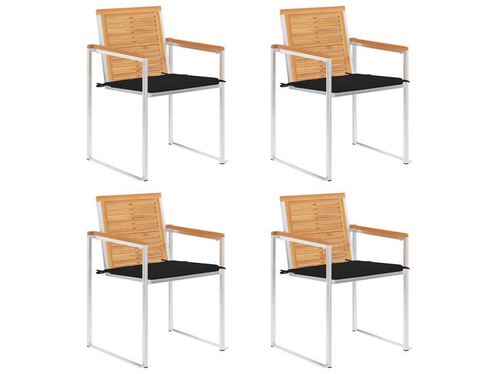 Tíkový nábytok je vyhotovený z mimoriadne trvácneho tvrdého tíkového dreva, ktoré bolo umelo vysušené v sušiarni a jeho povrch bol následne jemne obrúsený, aby získal hladký vzhľad. Tíkové drevo sa vyznačuje výnimočnou pevnosťou a odolnosťou voči poveternostným vplyvom, a tak predstavuje jeden z najvhodnejších materiálov na výrobu záhradného nábytku spomedzi všetkých ostatných druhov dreva. Ak si chcete zaobstarať záhradný nábytok, ktorý vám bude slúžiť dlhé roky, tíkové drevo je pre vás ako stvorené. Vďaka vysokokvalitnému rámu z nehrdzavejúcej ocele sú tiež veľmi trvanlivé, odolné voči hrdzi a robustné. Vankúše sú nielen praktické, ale majú aj dekoratívnu funkciu. Posaďte sa na krásnu vonkajšiu večeru alebo si len oddýchnite a užívajte si počasie s touto klasickou sadou záhradných stoličiek.