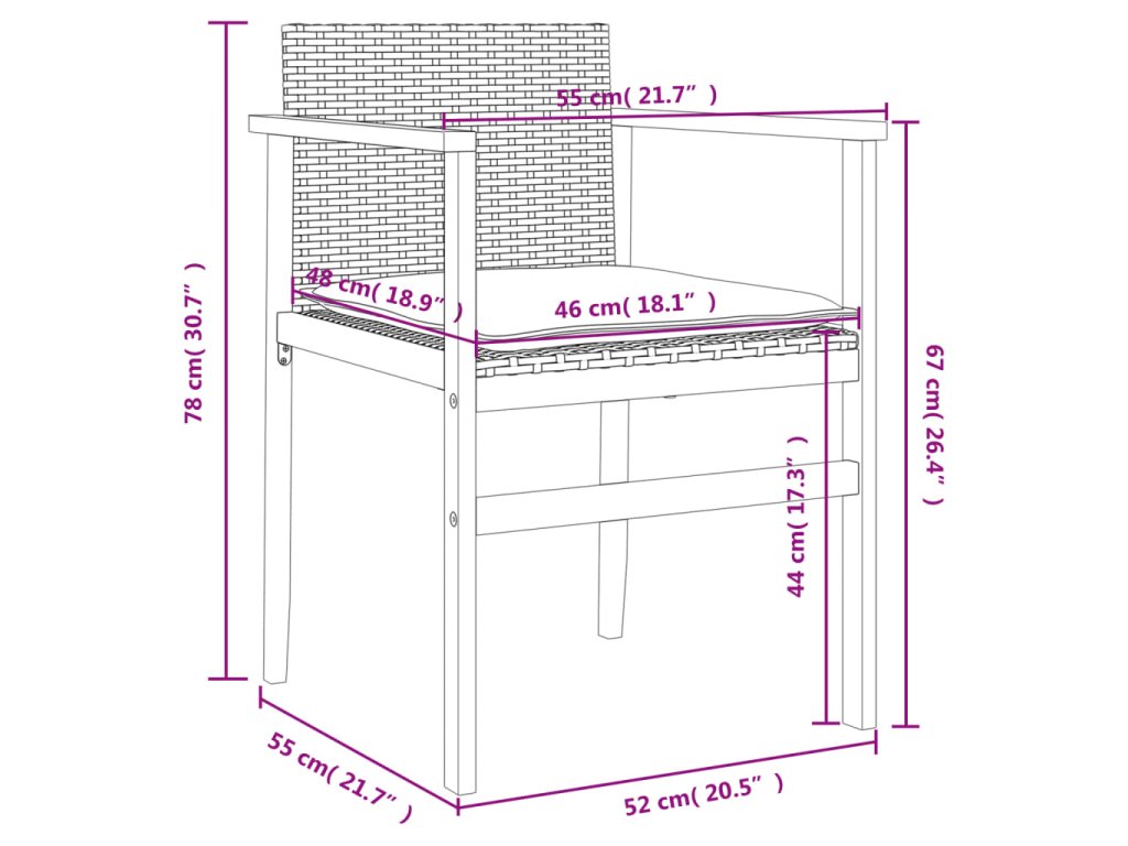 - Materiál: PE ratan, akáciový masív s prírodným olejovým náterom, oceľ s práškovou povrchovou úpravou