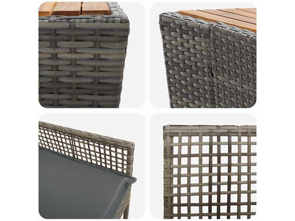 - Odolný poly ratan Celý rám je vyrobený z poly ratanu, ktorý odoláva všetkým poveternostným podmienkam. Tento materiál zaisťuje dlhú trvácnosť bistro setu.