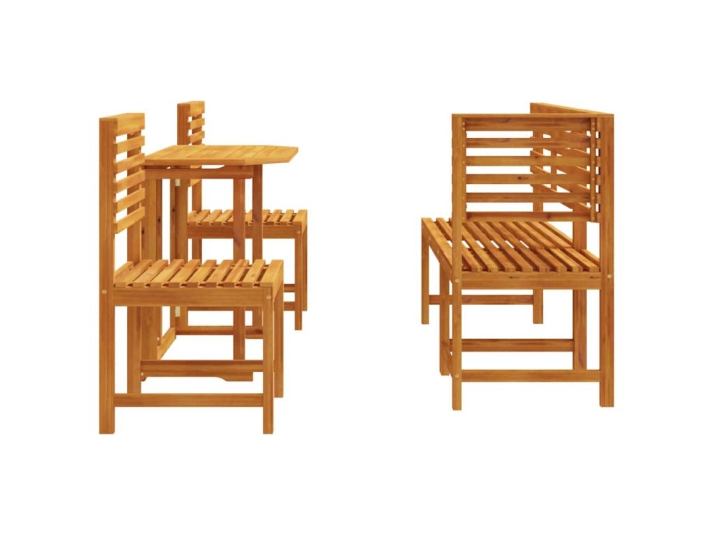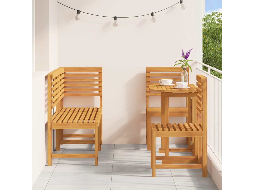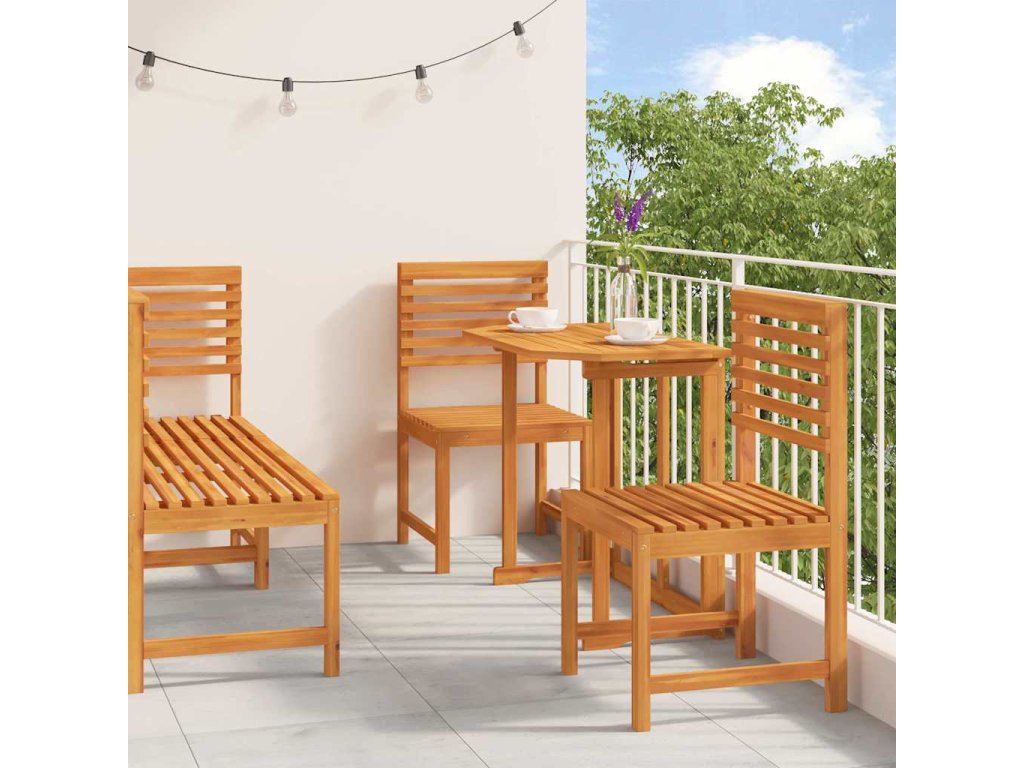 - Materiál: Solidné akáciové drevo dáva tomuto robustnému bistro setu odolnosť a prírodný vzhľad, ktorý mu skvele ladí so záhradou. Oceniteľný pre svoje odolné vlastnosti voči počasiu, materiál zabezpečuje, že set zostane vo výbornom stave na jar aj v lete.