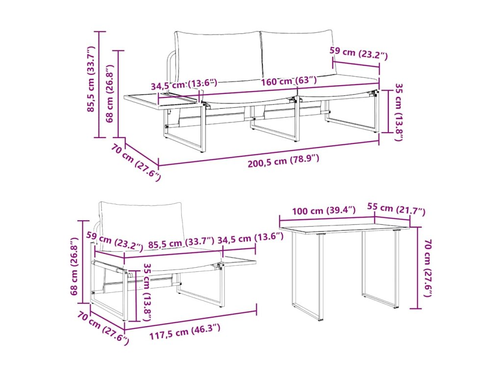 - 1 x 2-miestna pohovka: 200.5 x 70 x 85.5 cm (D x Š x V)