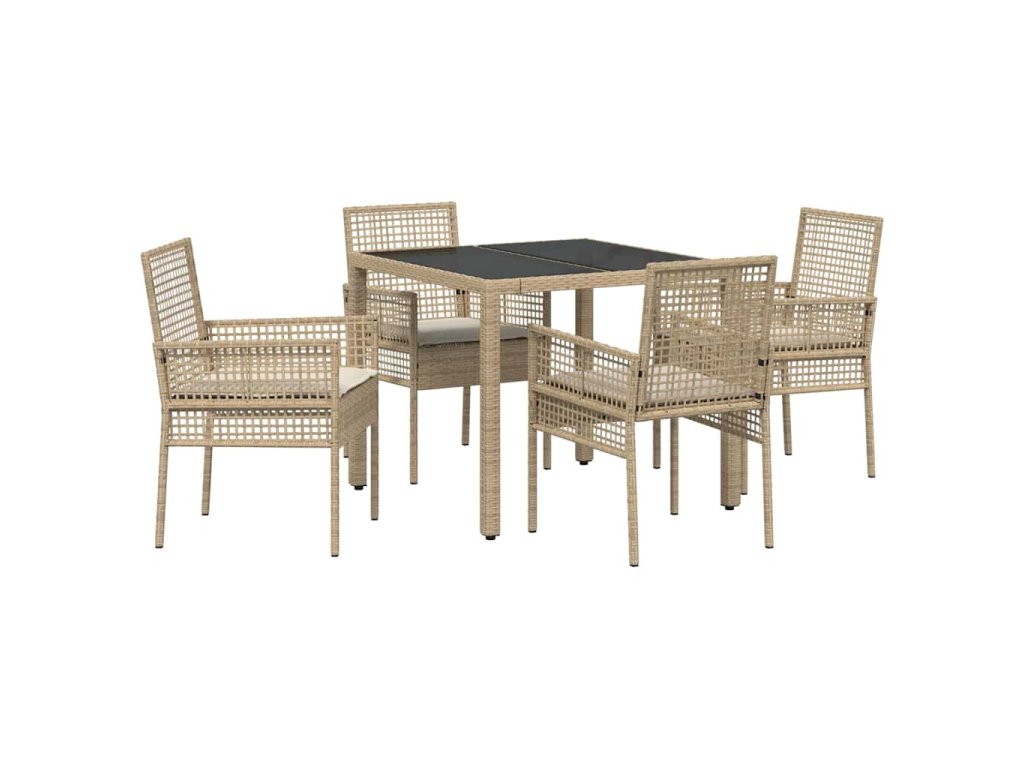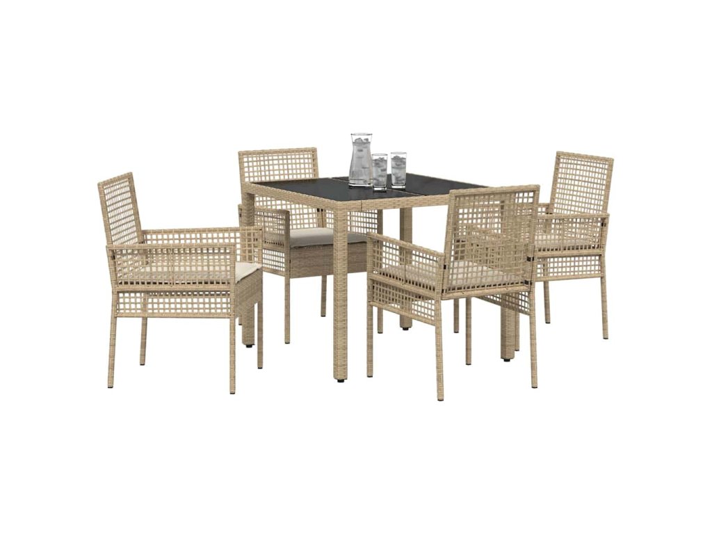 - Materiály: Tento moderný jedálenský set do záhrady je vyrobený z poly ratanového materiálu, známeho svojou odolnosťou a krásnym vzhľadom. Tvrdený sklenený stôl dodáva nádych modernity a ponúka hladký a štýlový povrch na jedlo, ktorý odoláva vonkajším podmienkam.