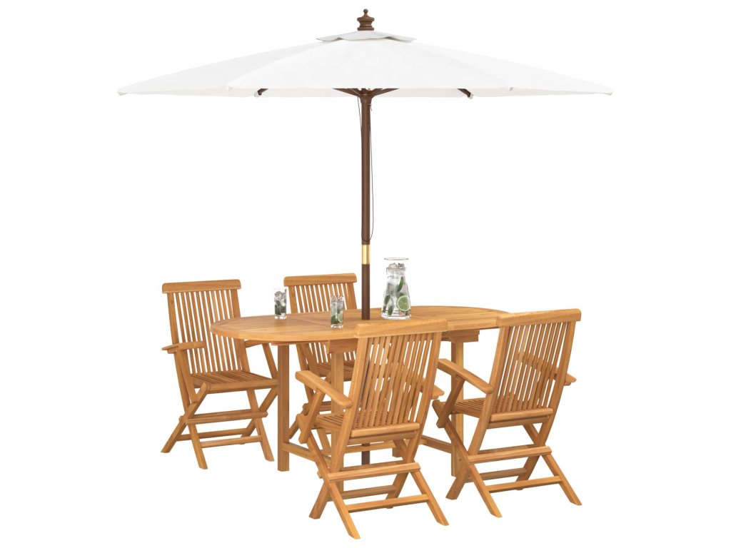 - Masívne teakové drevo: Vychutnajte si trvanlivosť a silu teaku, ktorý je známy svojou odolnosťou voči vonkajším podmienkam. Tento materiál zabezpečuje, že set ostáva stabilný a pekný, pričom pridáva teplé, zemité tóny do vášho priestoru.