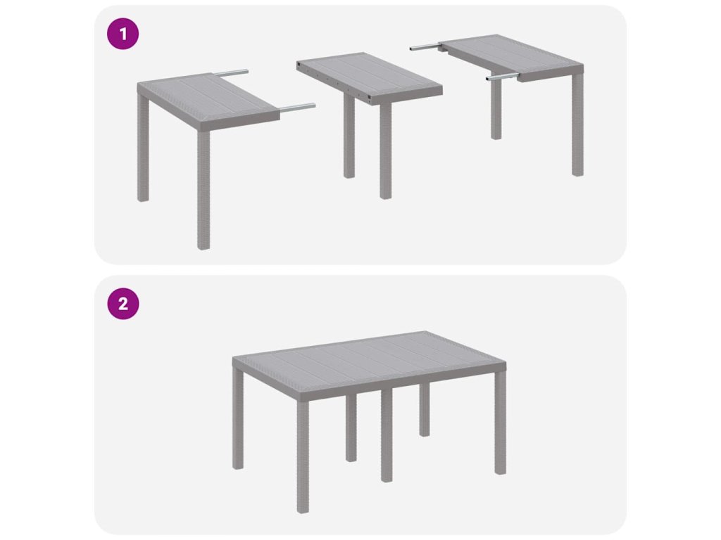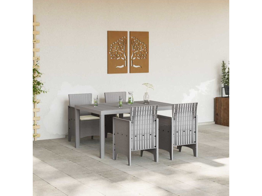 - Materiály: Tento záhradný jedálenský set je väčšinou z polyratanu, takže je pevný a štýlový, ideálny na vonkajší život. Materiál je UV-odolný, chráni ho pred slnkom a dlhodobo udržuje pekný vzhľad.