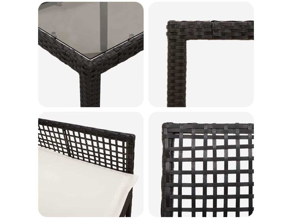 - Materiály: Tento moderný jedálenský set do záhrady je vyrobený z poly ratanového materiálu, známeho svojou odolnosťou a krásnym vzhľadom. Tvrdený sklenený stôl dodáva nádych modernity a ponúka hladký a štýlový povrch na jedlo, ktorý odoláva vonkajším podmienkam.