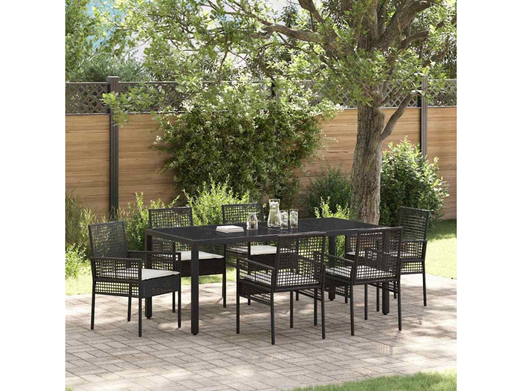 Tento moderný jedálenský set je skvelým stredobodom pozornosti pre akúkoľvek vonkajšiu plochu a spája styl s funkčnosťou. Vďaka elegantným líniám a minimalistickému dizajnu prináša nádych elegancie, či už sa jedná o neformálne stretnutia, alebo formálne jedlá vonku. Je ideálny na moderné záhrady a terasy, poskytuje dosť sedenia a príjemnú atmosféru. Premyslená kombinácia poly ratanového materiálu a tvrdeného skla vyžaruje sofistikovanosť, a pohodlné vankúše zabezpečujú komfortný jedálenský zážitok.