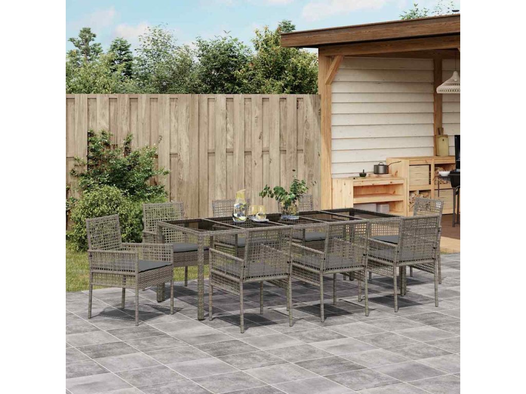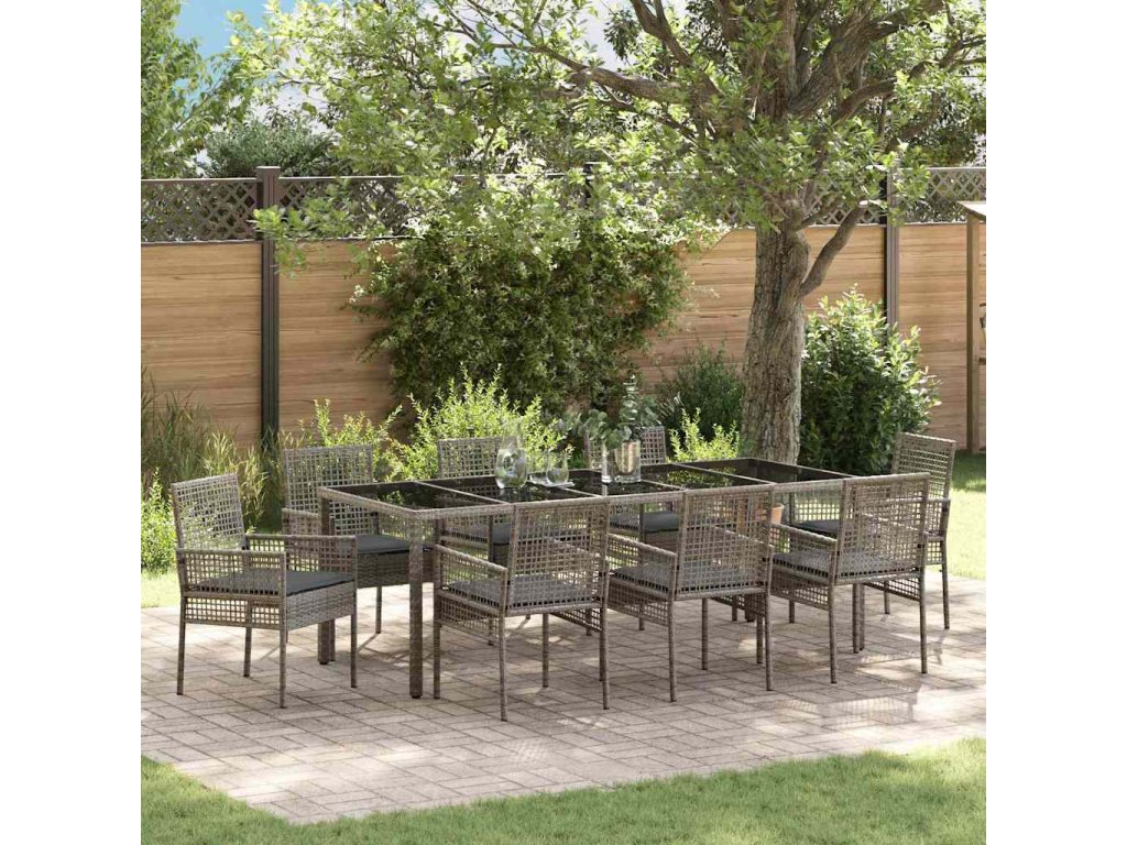 Tento moderný jedálenský set je skvelým stredobodom pozornosti pre akúkoľvek vonkajšiu plochu a spája styl s funkčnosťou. Vďaka elegantným líniám a minimalistickému dizajnu prináša nádych elegancie, či už sa jedná o neformálne stretnutia, alebo formálne jedlá vonku. Je ideálny na moderné záhrady a terasy, poskytuje dosť sedenia a príjemnú atmosféru. Premyslená kombinácia poly ratanového materiálu a tvrdeného skla vyžaruje sofistikovanosť, a pohodlné vankúše zabezpečujú komfortný jedálenský zážitok.