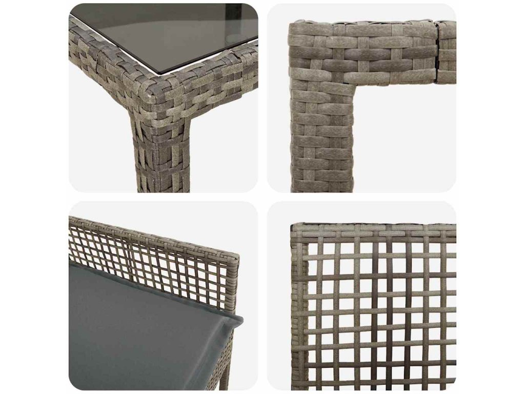- Materiály: Tento moderný jedálenský set do záhrady je vyrobený z poly ratanového materiálu, známeho svojou odolnosťou a krásnym vzhľadom. Tvrdený sklenený stôl dodáva nádych modernity a ponúka hladký a štýlový povrch na jedlo, ktorý odoláva vonkajším podmienkam.