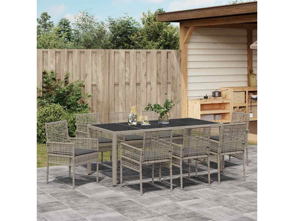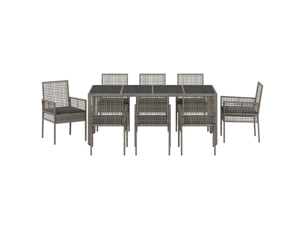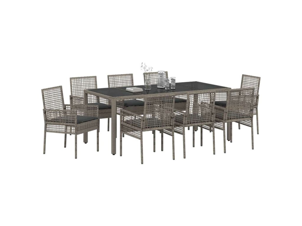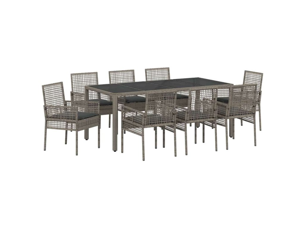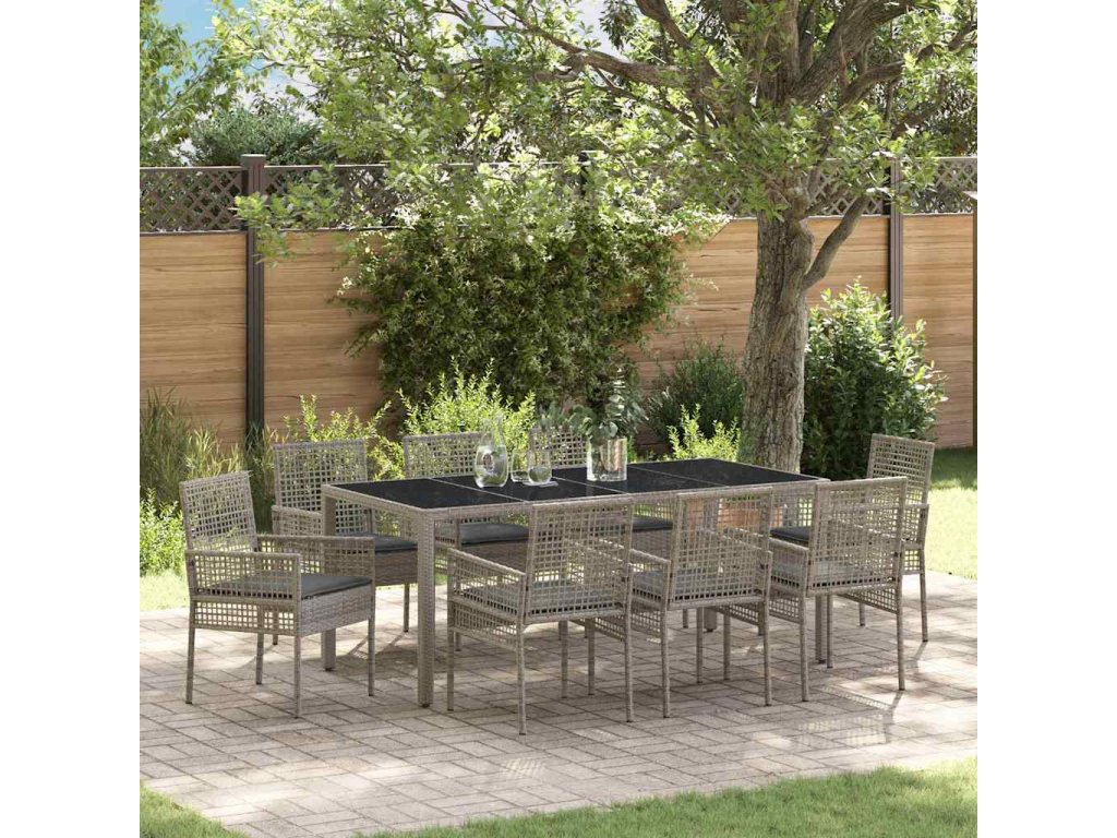 Tento moderný jedálenský set je skvelým stredobodom pozornosti pre akúkoľvek vonkajšiu plochu a spája styl s funkčnosťou. Vďaka elegantným líniám a minimalistickému dizajnu prináša nádych elegancie, či už sa jedná o neformálne stretnutia, alebo formálne jedlá vonku. Je ideálny na moderné záhrady a terasy, poskytuje dosť sedenia a príjemnú atmosféru. Premyslená kombinácia poly ratanového materiálu a tvrdeného skla vyžaruje sofistikovanosť, a pohodlné vankúše zabezpečujú komfortný jedálenský zážitok.