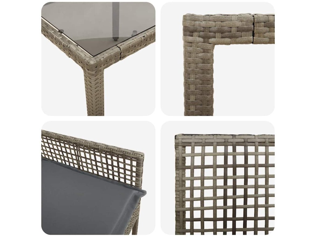 - Materiály: Tento moderný jedálenský set do záhrady je vyrobený z poly ratanového materiálu, známeho svojou odolnosťou a krásnym vzhľadom. Tvrdený sklenený stôl dodáva nádych modernity a ponúka hladký a štýlový povrch na jedlo, ktorý odoláva vonkajším podmienkam.