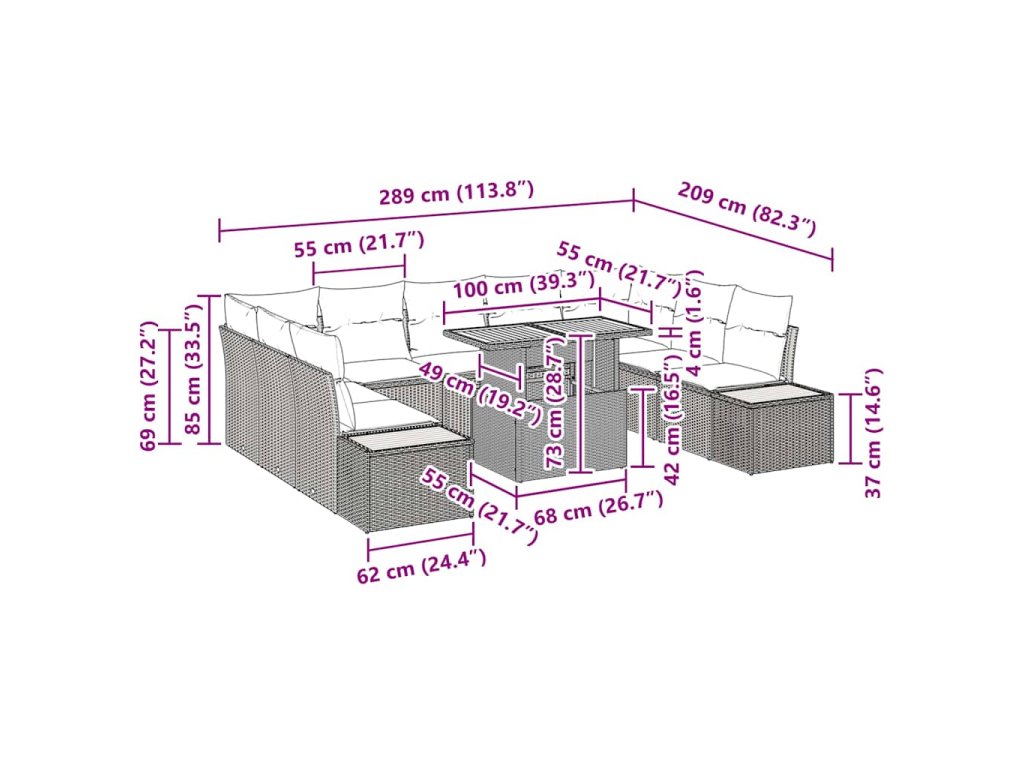 - Univerzálne komponenty: Sada obsahuje dve vedľajšie pohovky, dve rohové sedadlá, jedno centrálne sedadlo a záhradný stôl, čím ponúka dostatok sedenia a jedálenských riešení. Každý kus obsahuje úložný priestor na vankúše a iné nevyhnutnosti. Modulárny dizajn umožňuje prekonfigurovať zariadenie tak, aby vyhovovalo žiadaným usporiadaniam alebo sa prispôsobovalo hosťom, čím zabezpečuje jednoduchú prispôsobiteľnosť pre každú príležitosť.