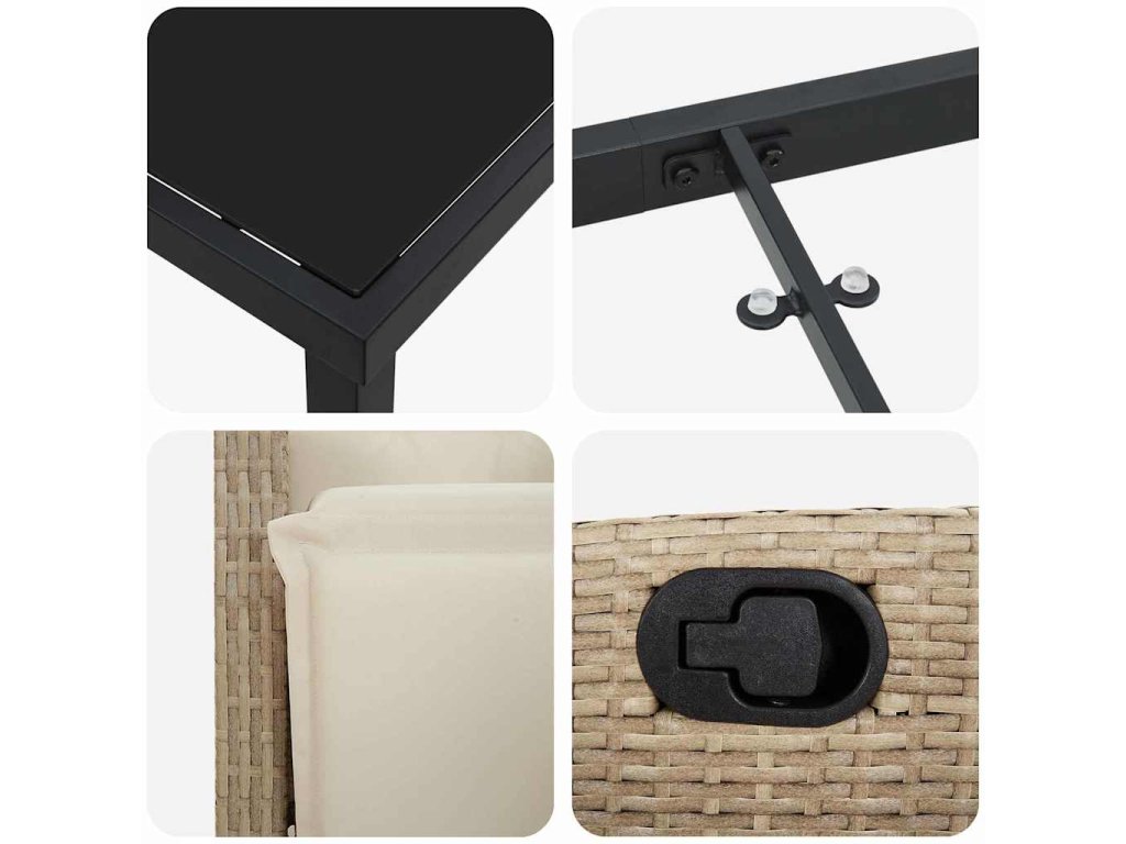 - Funkčné komponenty Tento set má stôl so sklom, ponúkajúci elegantný jedálenský priestor, ktorý je doplnený polyratanovými opierkami a sedacími vankúšmi pre väčšie pohodlie. Každý prvok je zaradený tak, aby poskytoval príjemný zážitok z jedenia.