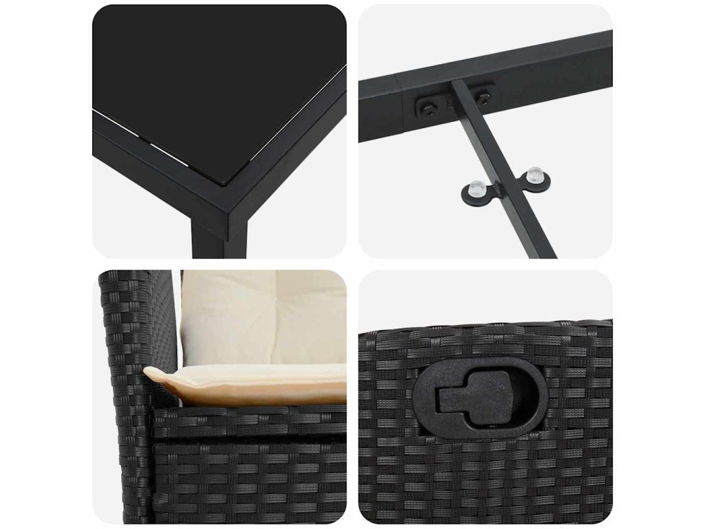 - Odolná konštrukcia: Tento moderný jedálenský set má starostlivo vybrané materiály, ktoré sú pripravené zvládnuť rôzne počasie. Polyratan sa používa na tkanie opierok a sedadiel, poskytujúc pohodlnú textúru a odolnosť voči UV žiareniu a vlhkosti. Oceľový rám zaisťuje stabilitu a štrukturálnu integritu, takže si budete môcť užiť vonkajšie chvíle bez obáv.
