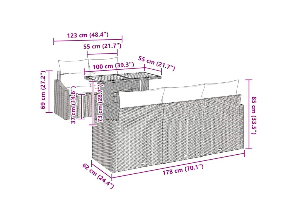 - Ergonomický dizajn: Navrhnuté pre pohodlie a štýl, tento set obsahuje plyšové polyesterové vankúše a sedadlá s penovým polstrovaním, ktoré podporujú uvoľnené stravovanie. S operadlom a hranatými lakťovými opierkami z polyratanu sľubuje zvýšené pohodlie. Dokončené operadlo zabezpečuje 360-stupňovú vizuálnu príťažlivosť, takže každý útulný kút vyzerá úchvatne.