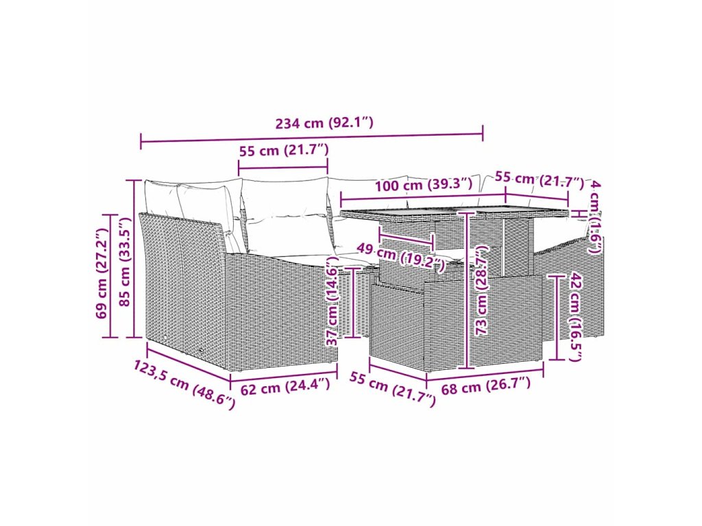 - Praktické komponenty: Tento set obsahuje dva celozápalkové pohovky, dva rohové sedadlá, dve stredové sedadlá a jeden záhradný stôl, každý integrovaný s úložnými funkciami. Navrhnuté pre vonkajšie pohodlie, nábytkové kusy poskytujú priestranné oddelenia na organizáciu nevyhnutných vecí a udržiavajú tak upravený a funkčný vonkajší priestor.